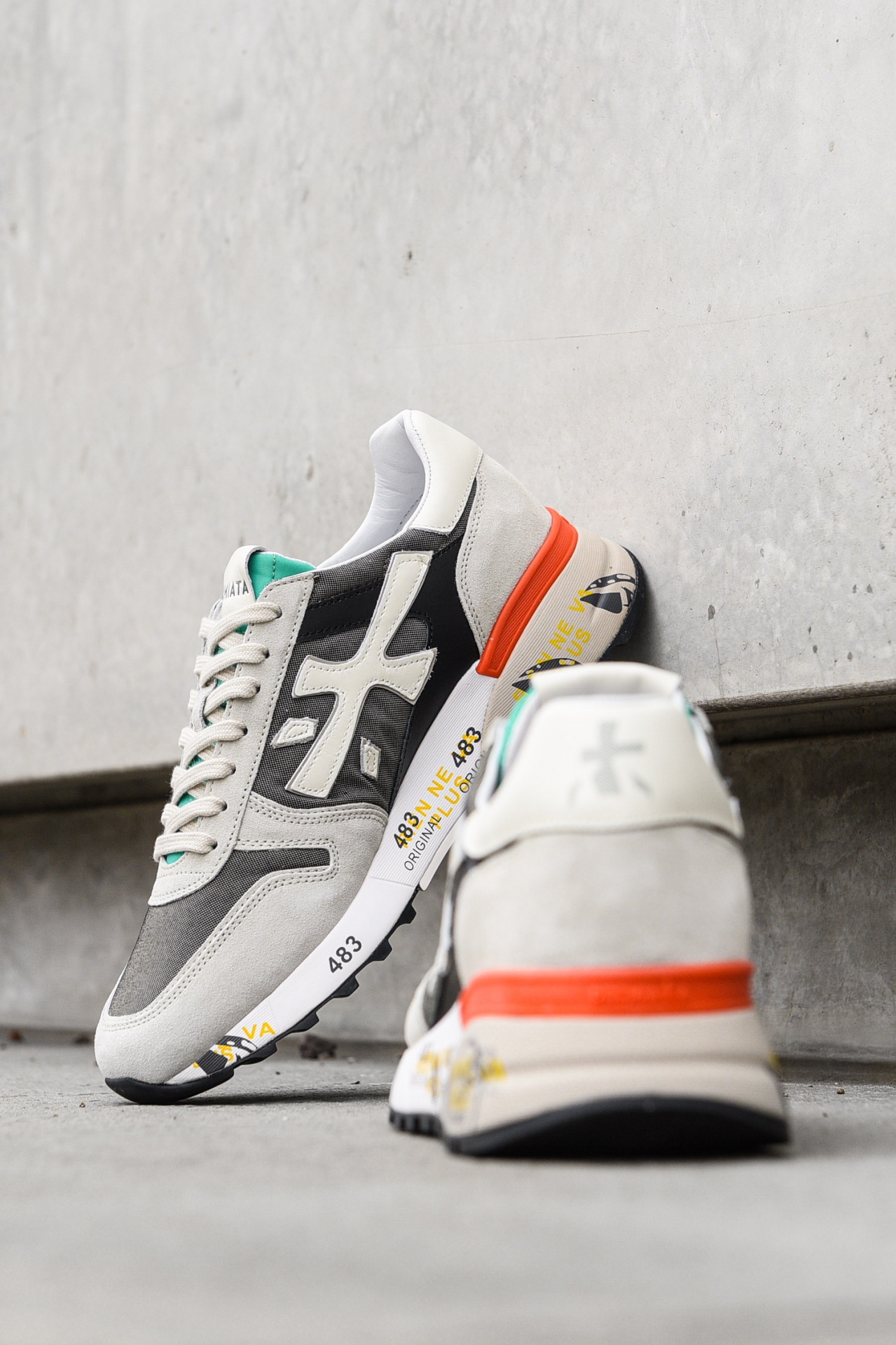 L'iconica silhouette è arrichita dal logo Premiata e dallo spoiler color arancio