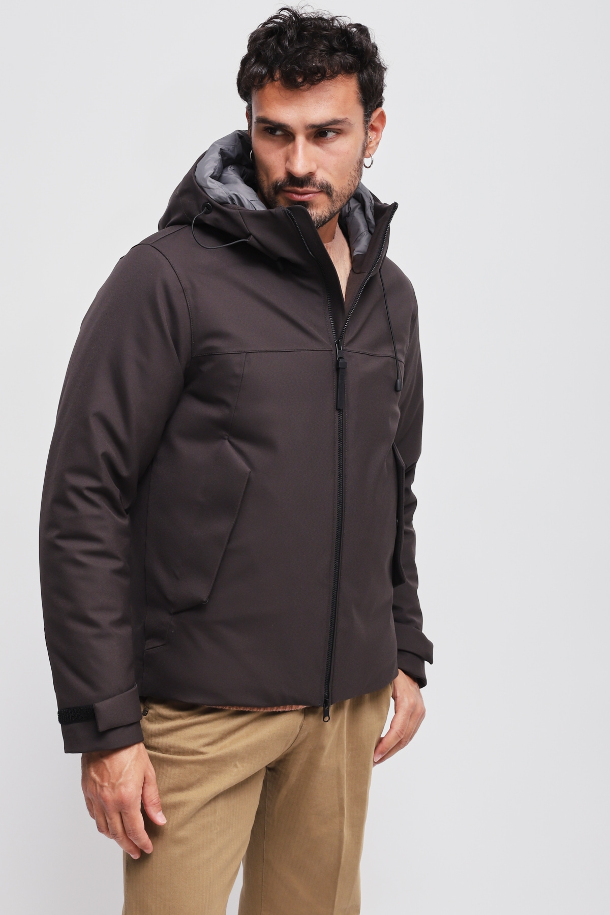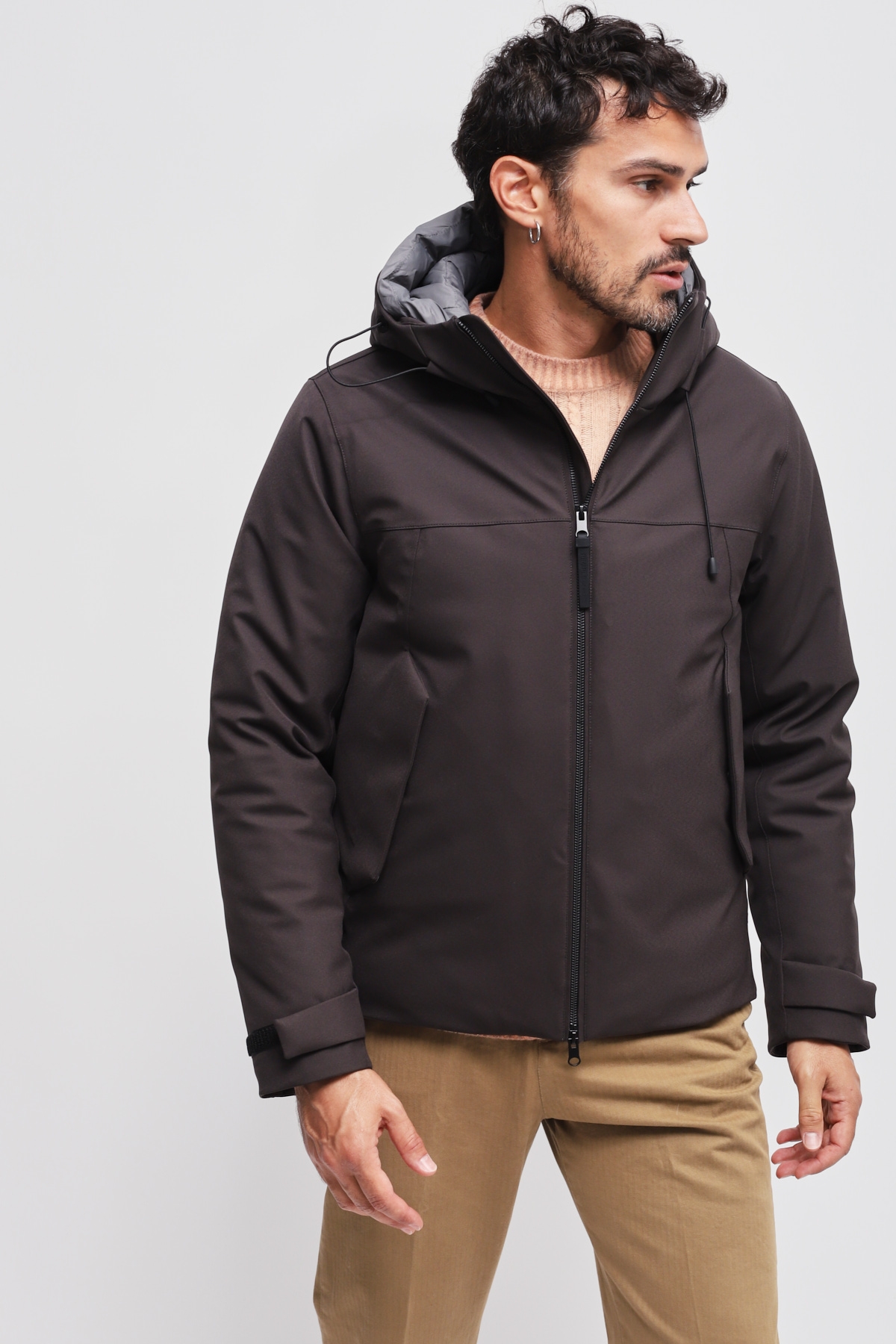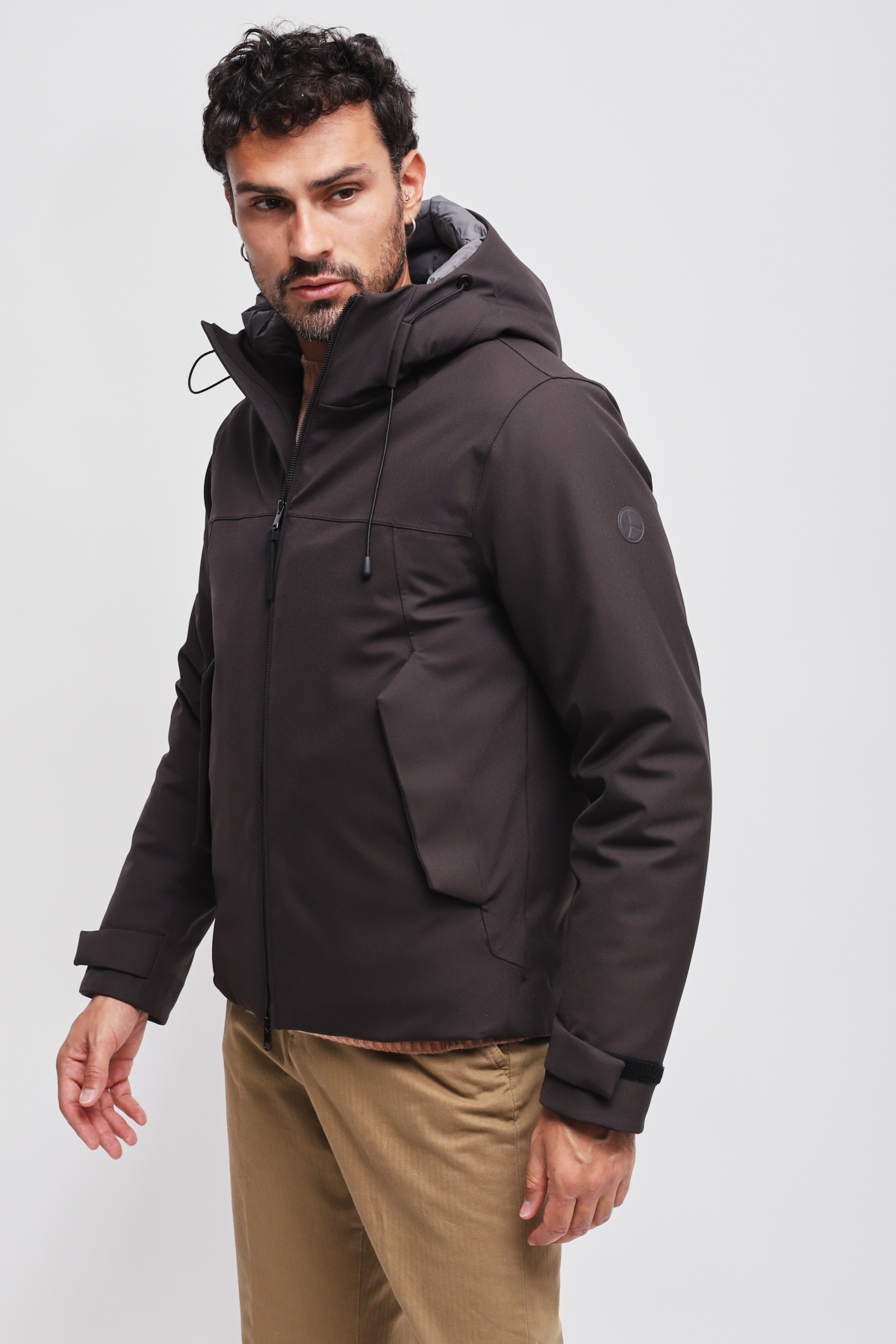 - Giubbino in tessuto tecnico three layers con membrana con cappuccio con coulisse.