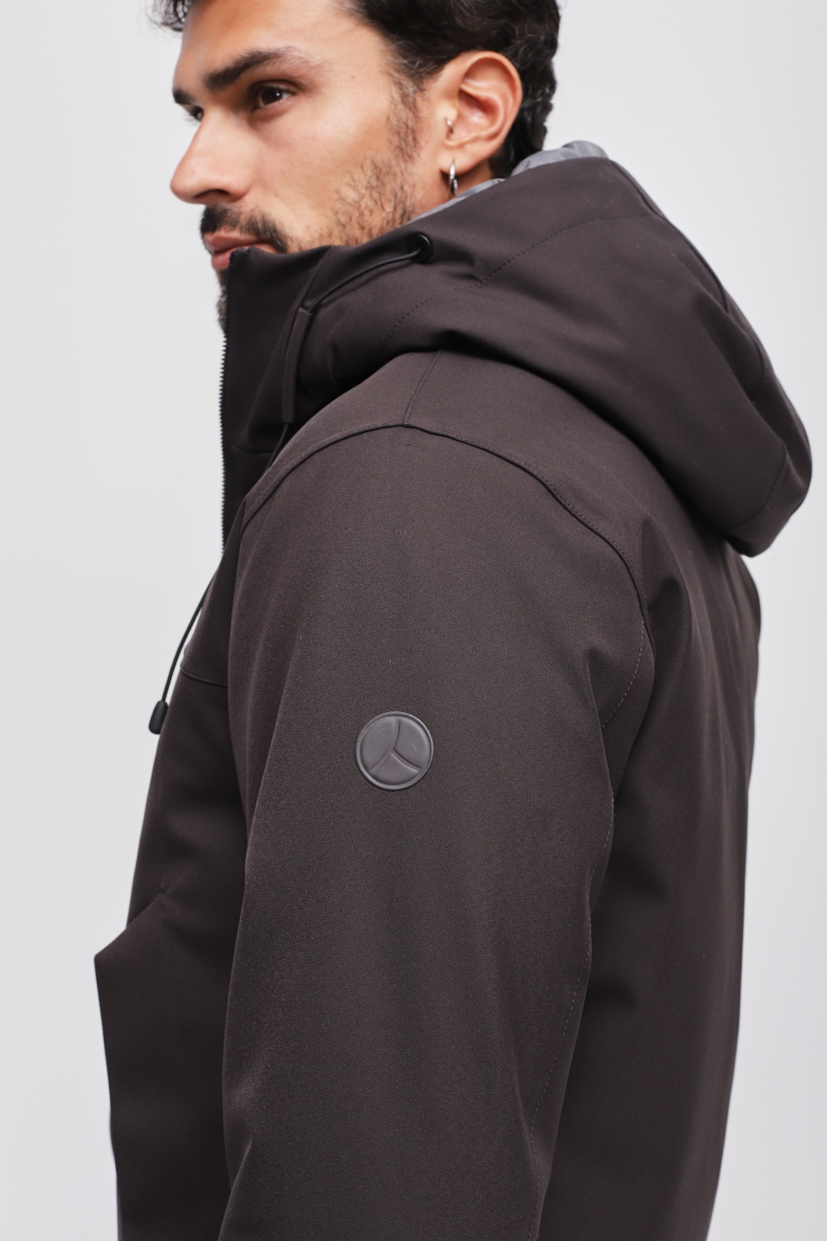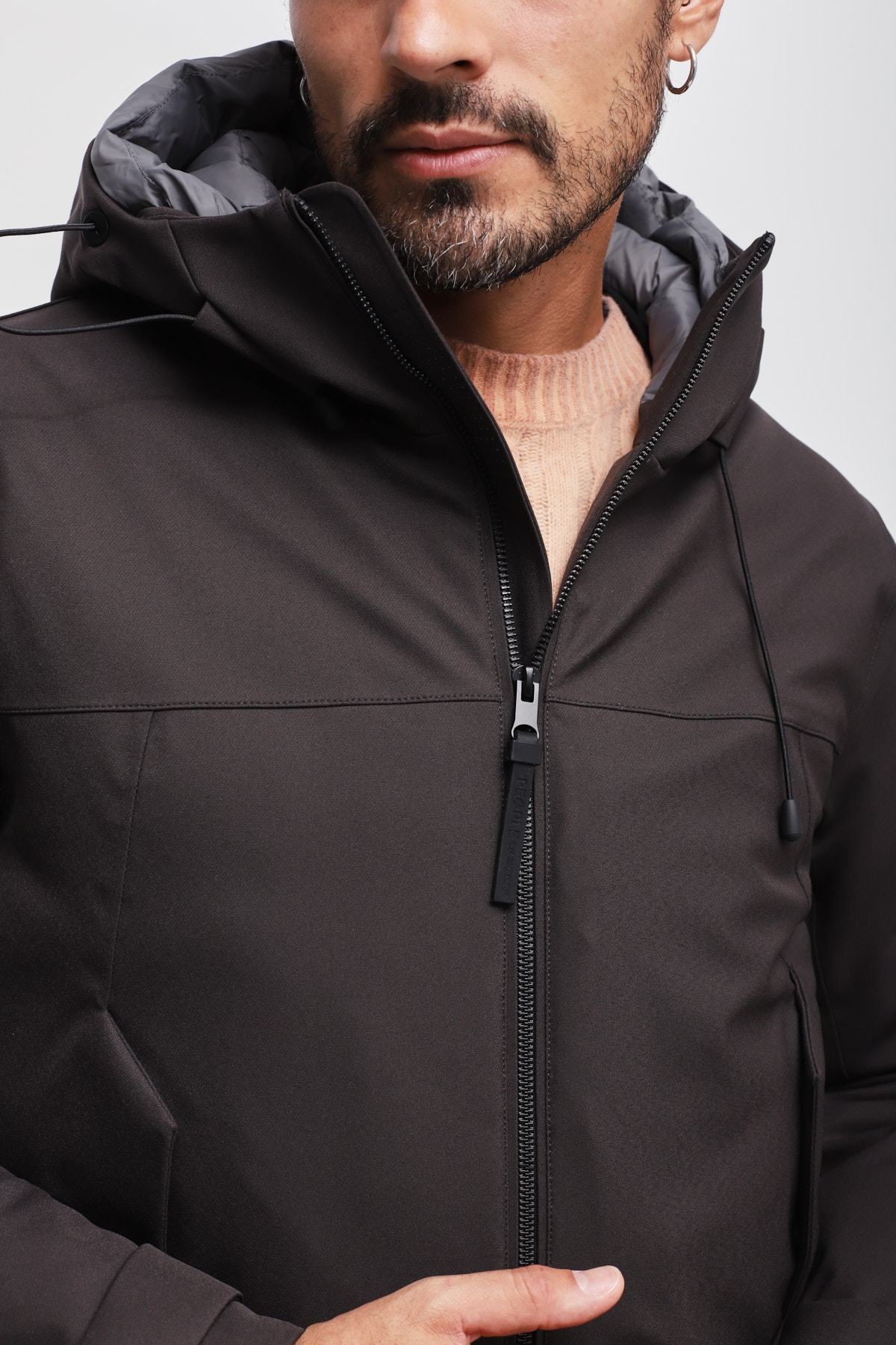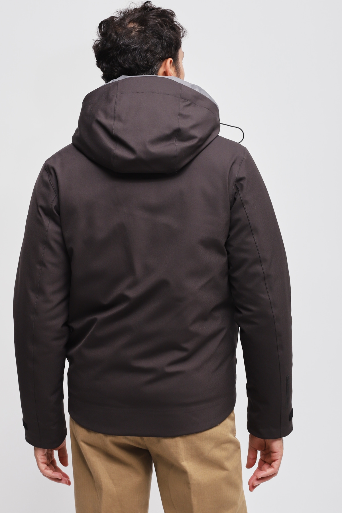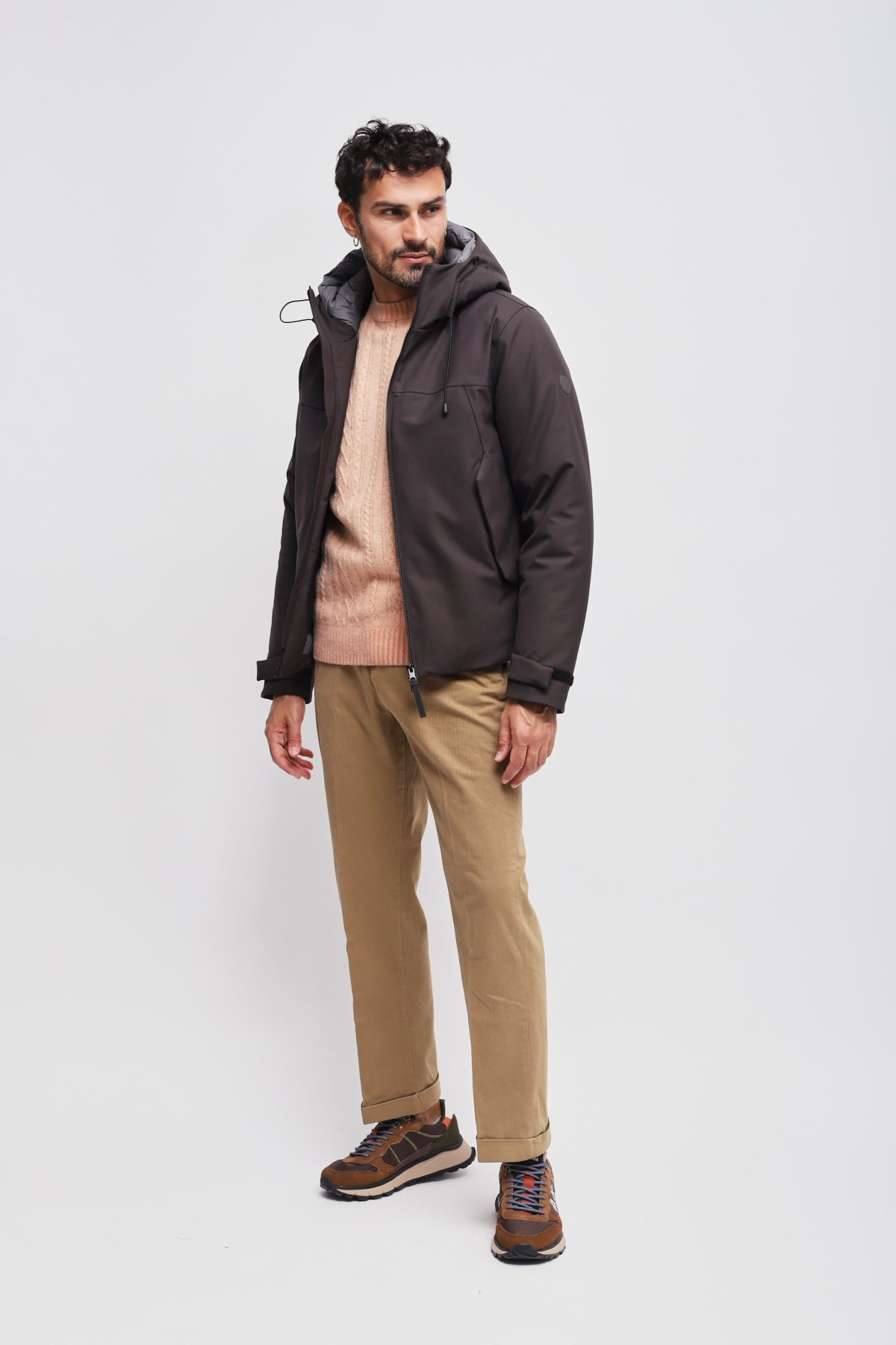 - Giubbino in tessuto tecnico three layers con membrana con cappuccio con coulisse.