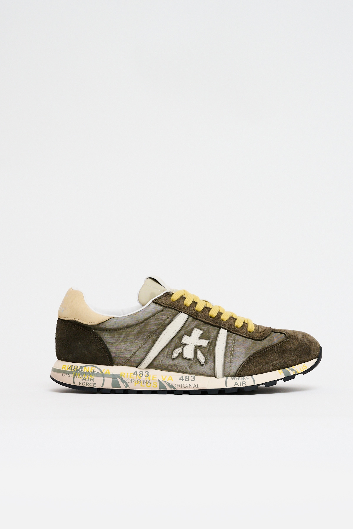 Sneaker Lucy 7767 di Premiata realizzata in nylon e pelle scamosciata nei toni del verde. Presenta iconico logo laterale , lacci in cotone a contrasto e tallone logato in pelle nella tonalità beige. Dotata di linguetta logata, fodera e soletta in pelle. Suola in gomma con decori tipici del brand. Altezza: 2cm.