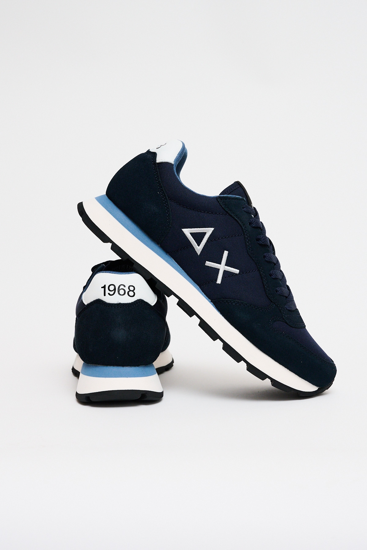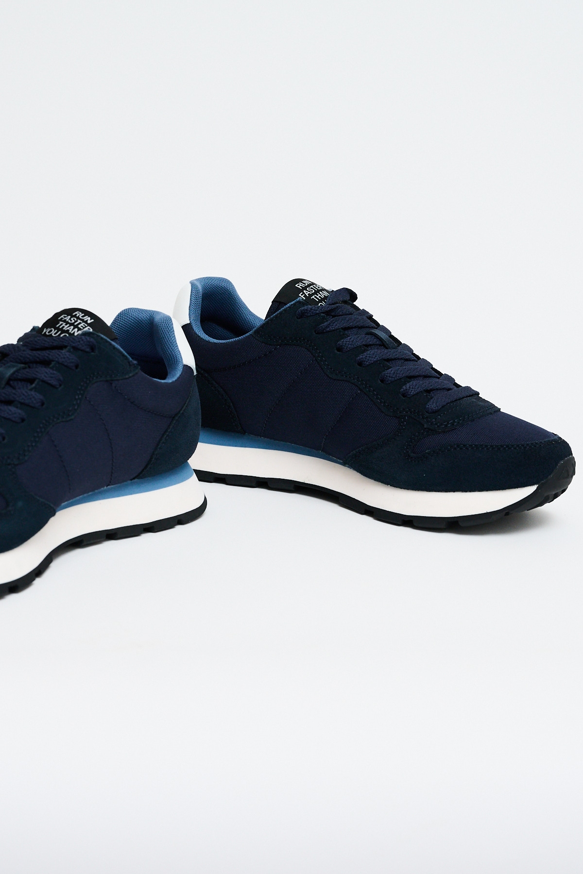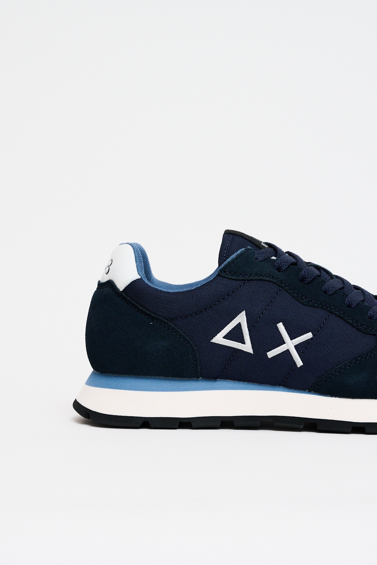La Sneakers Tom Solid Navy Blue è una sneakers stile running realizzata in nylon e suede, con chiusura con lacci in cotone, logo ricamato sul lato, fodera in micro mesh e suola in EVA fresata a mano e battistrada in gomma.