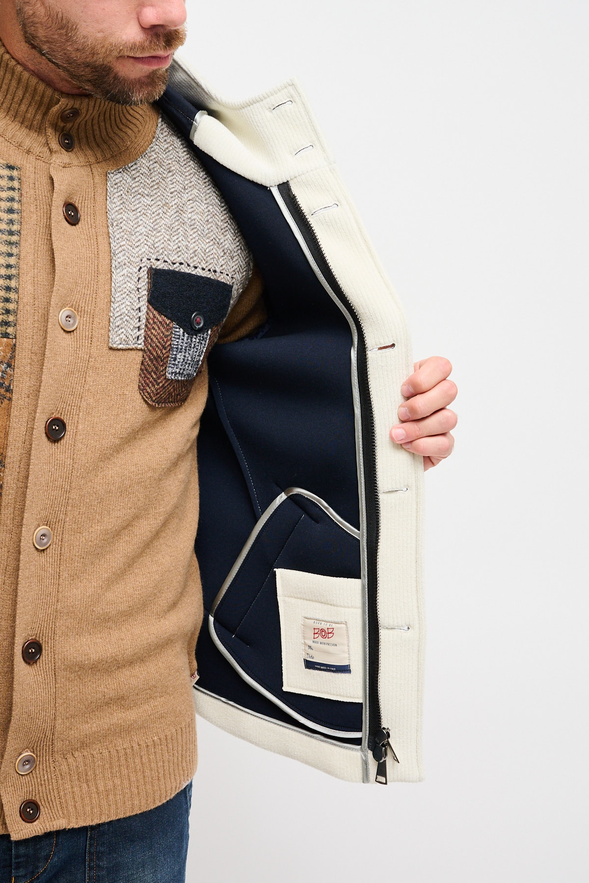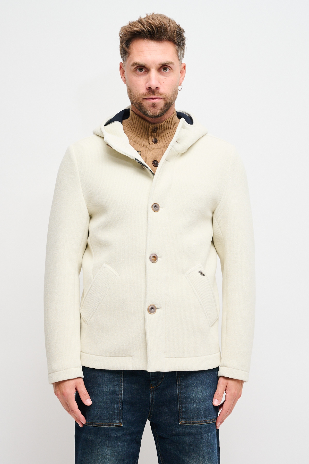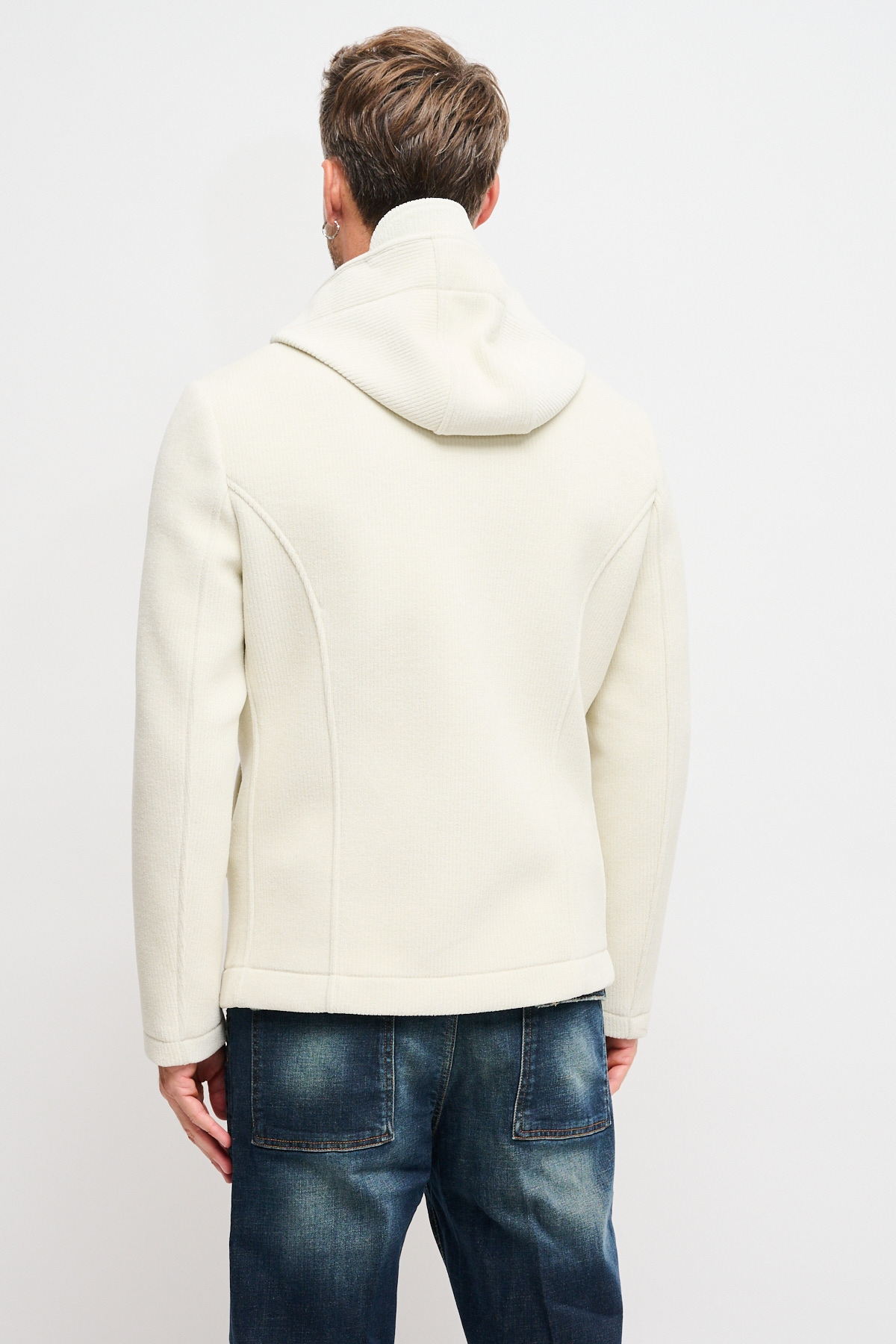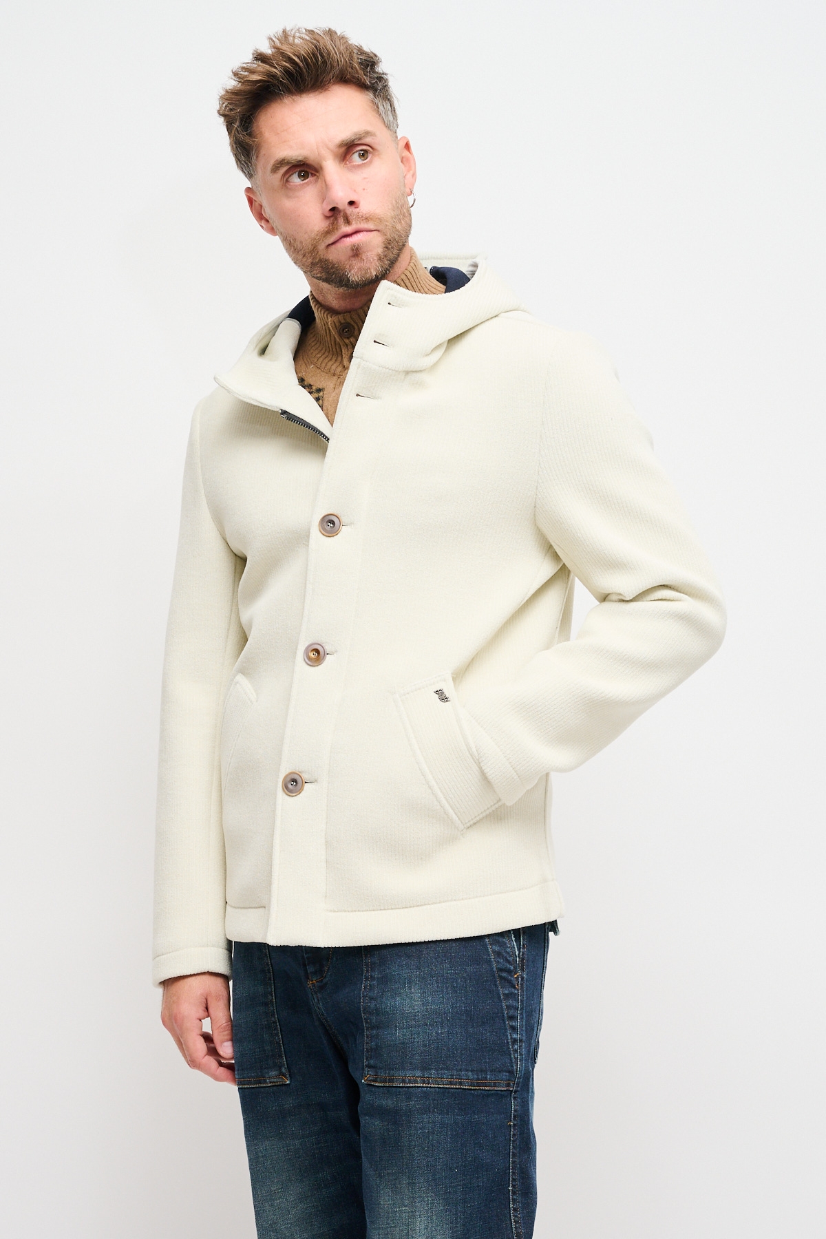 Giubbotto effetto velluto colore panna con cappuccio e chiusura zip/bottoni, reinterpretazione moderna del montgomery, elegante e versatile per look casual e sofisticati.