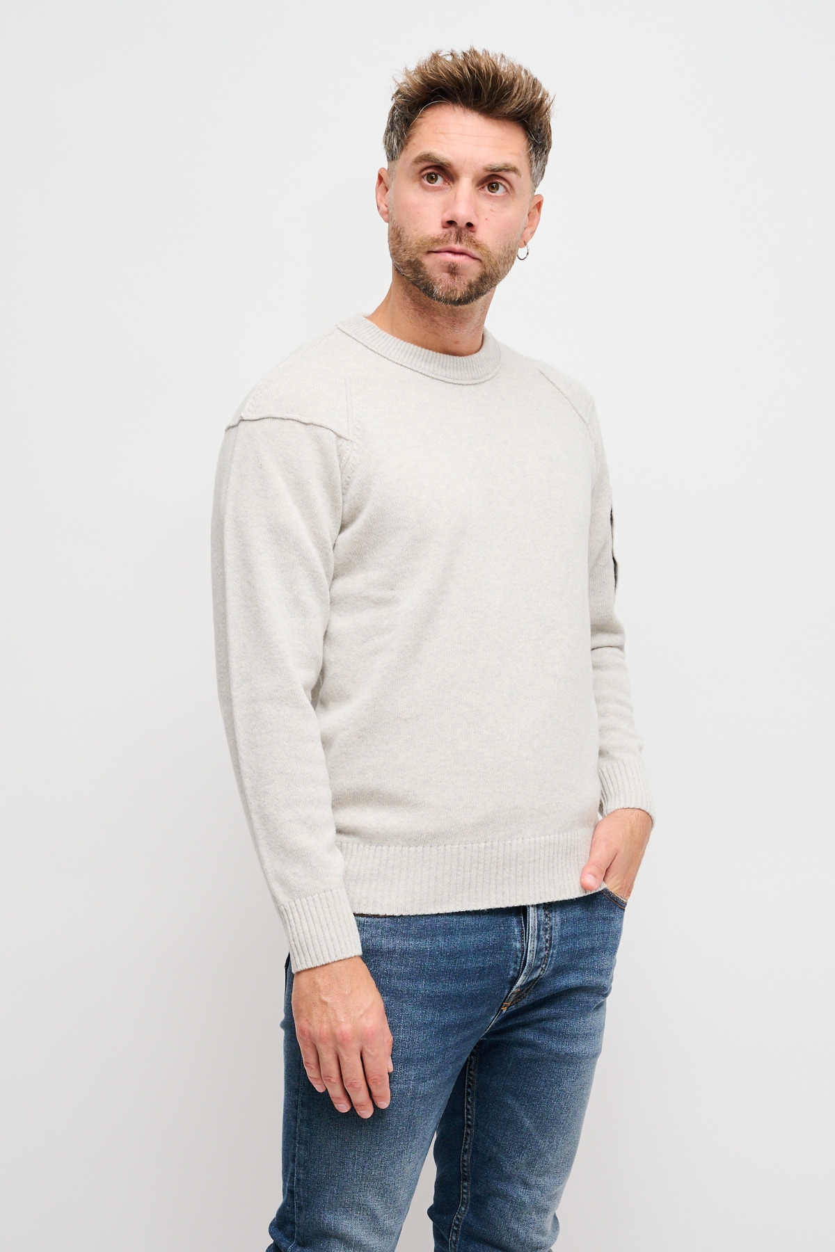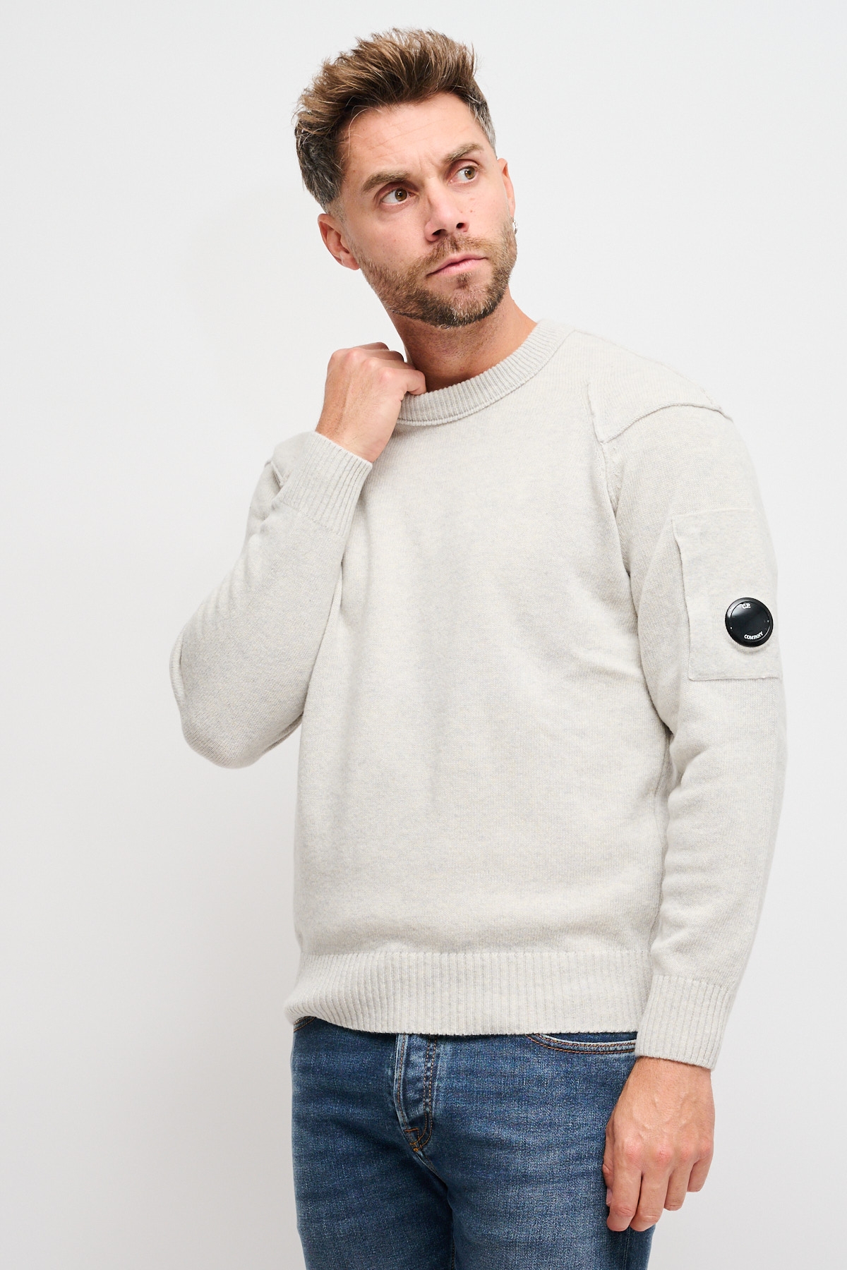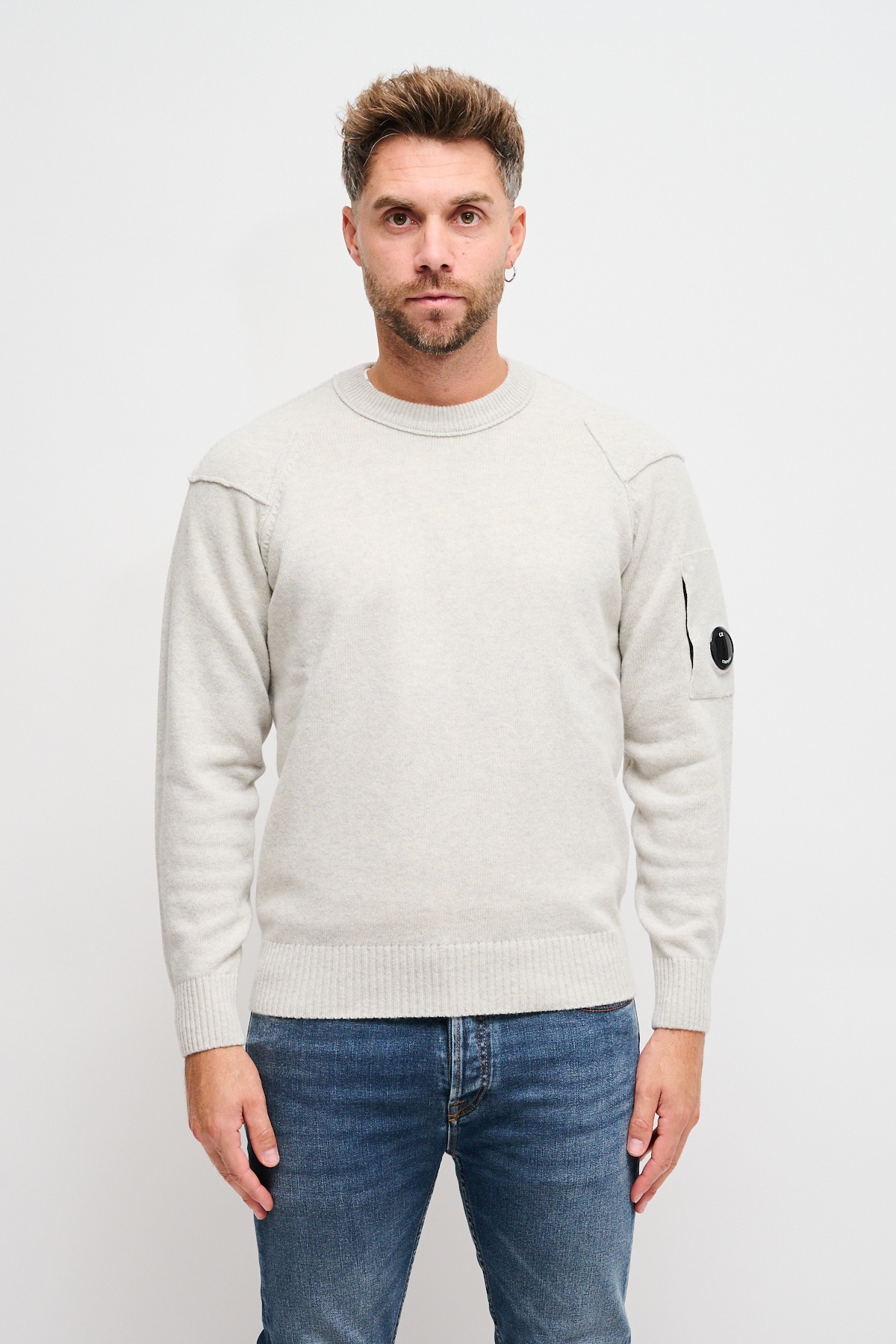 Maglione girocollo realizzato in Lambswool GRS. La certificazione Global Recycled Standard garantisce il rispetto di criteri ambientali e sociali in tutte le fasi della filiera. Il capo presenta l’iconica Lente di C.P. Company, cuciture a contrasto, polsini e orlo a costine. Finezza 7. Regular fit.