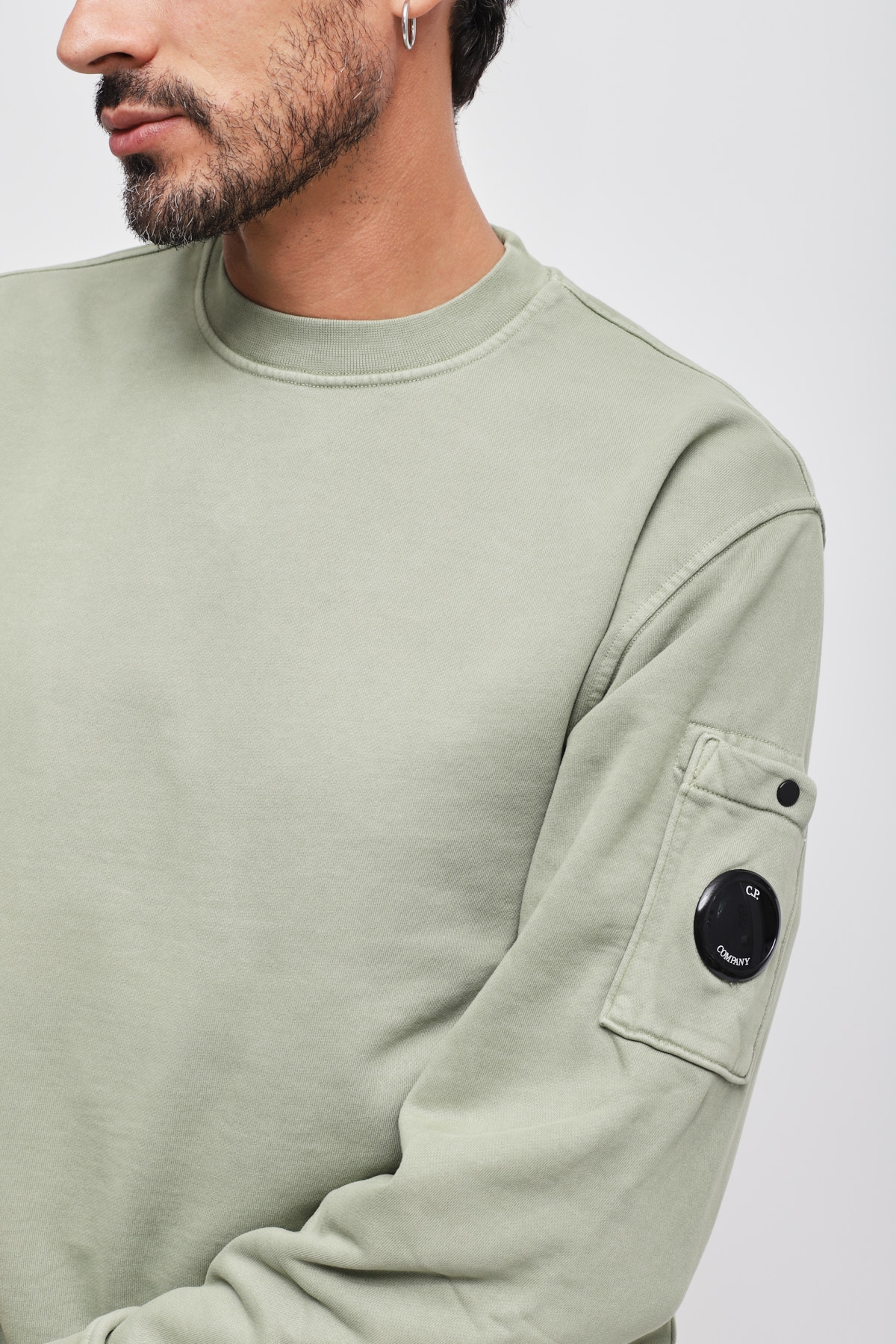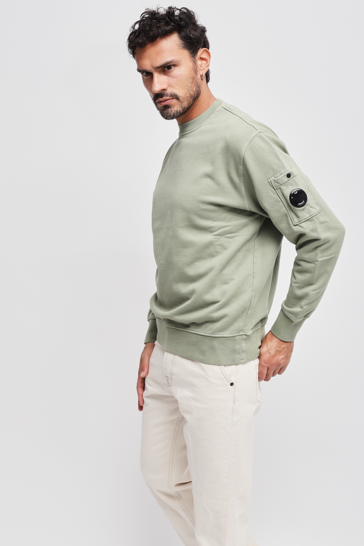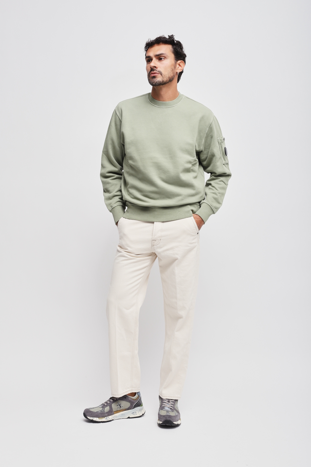 Maglia girocollo realizzata in 100% cotone con orlo e polsi a costine, taschino con bottone a pressione e dettaglio lente sulla manica sinistra. Old dyed. Vestibilità regolare.