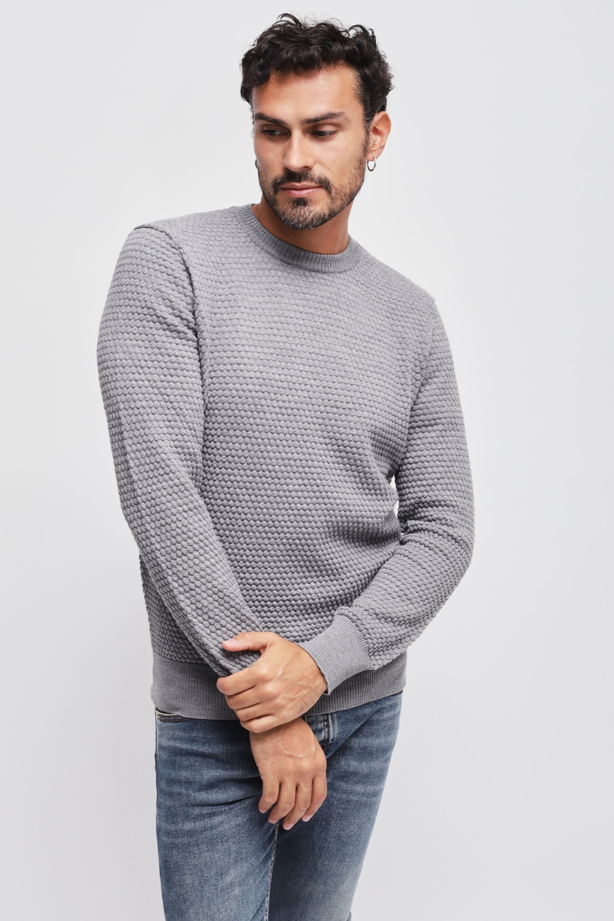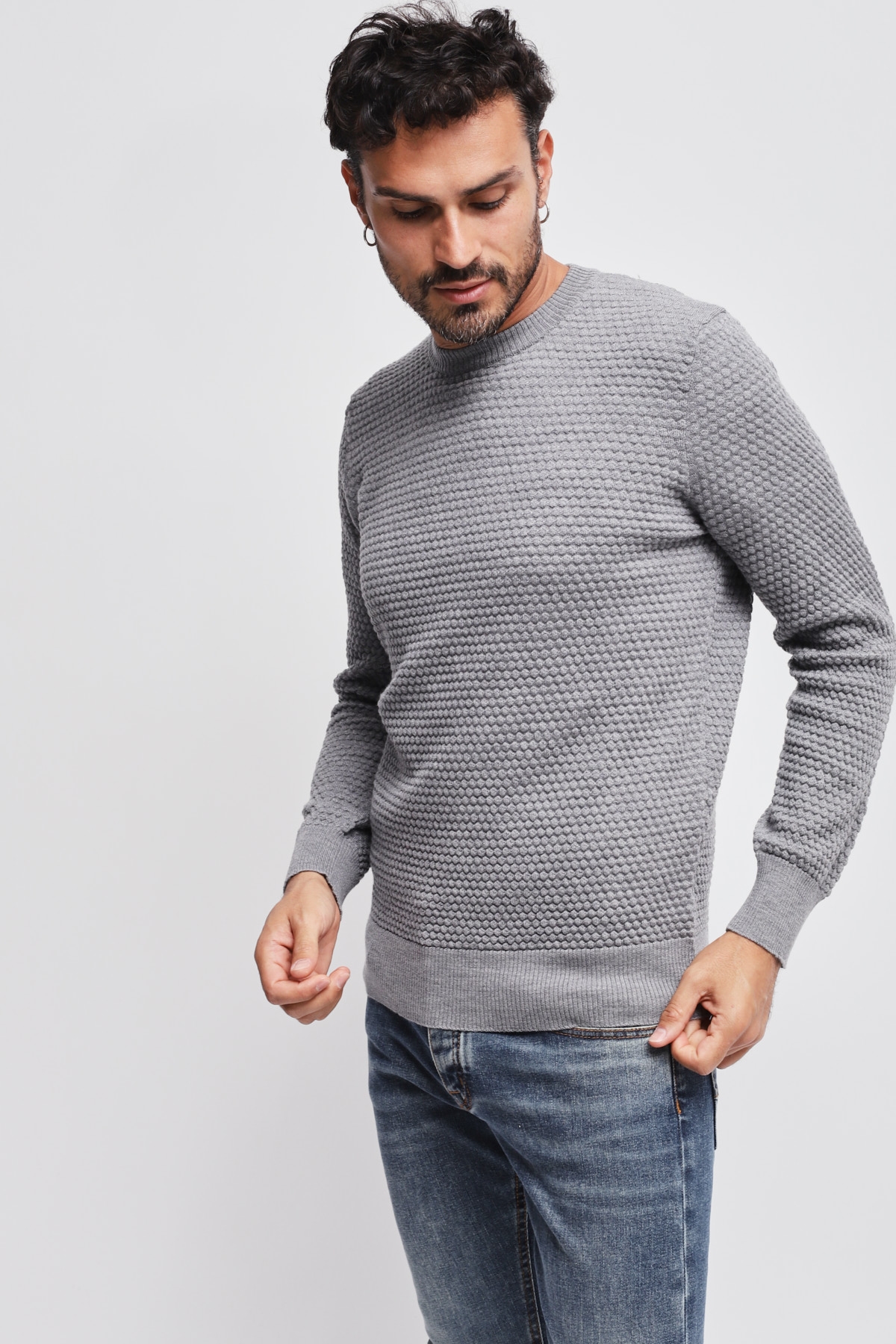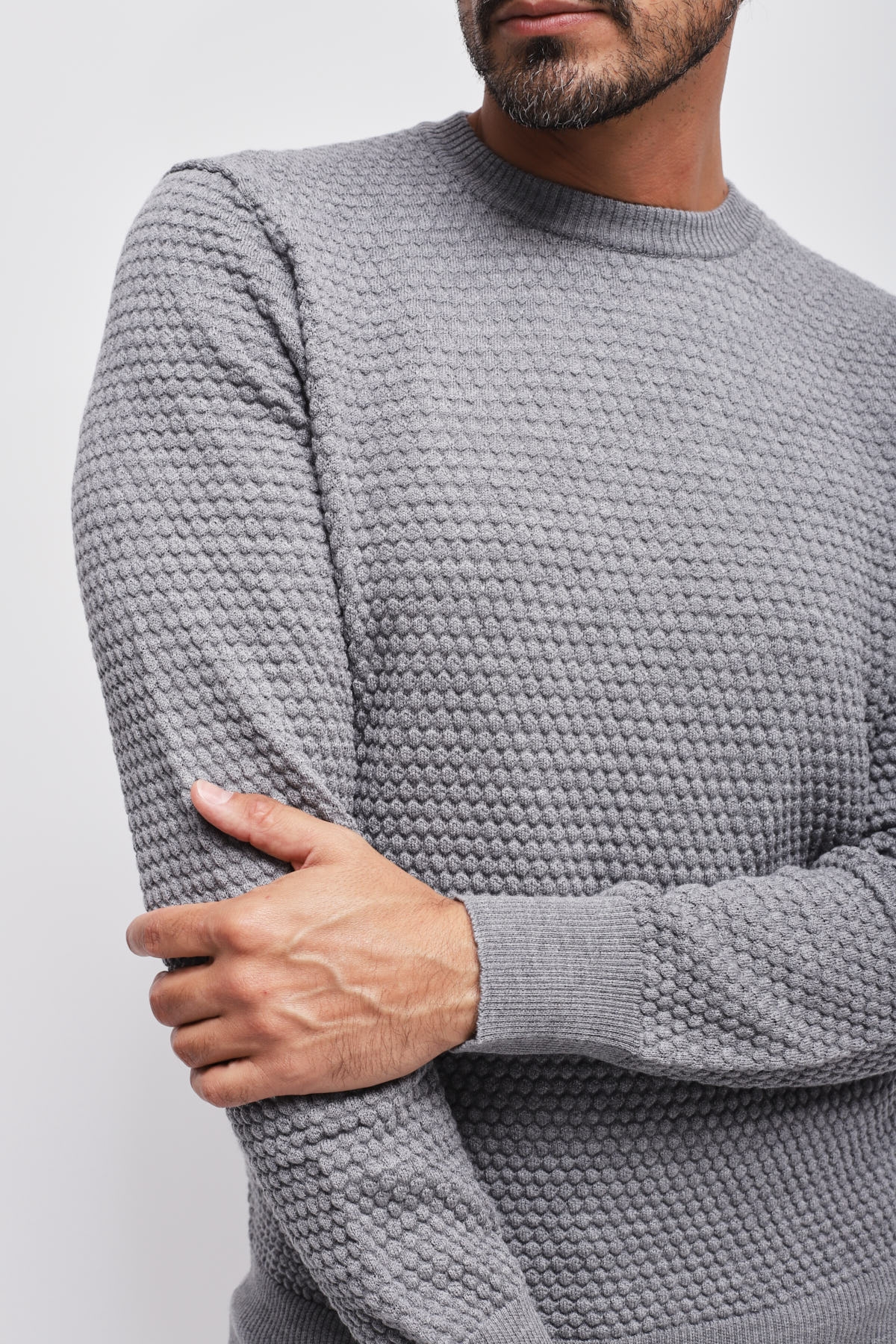 Maglione in lana a girocollo della nuova collezione Kangra uomo autunno inverno 2025. Il modello ha una lavorazione del tessuto a nido d'ape, effetto 3D e maniche lunghe. Polsini, girocollo e fondo a coste elastiche.