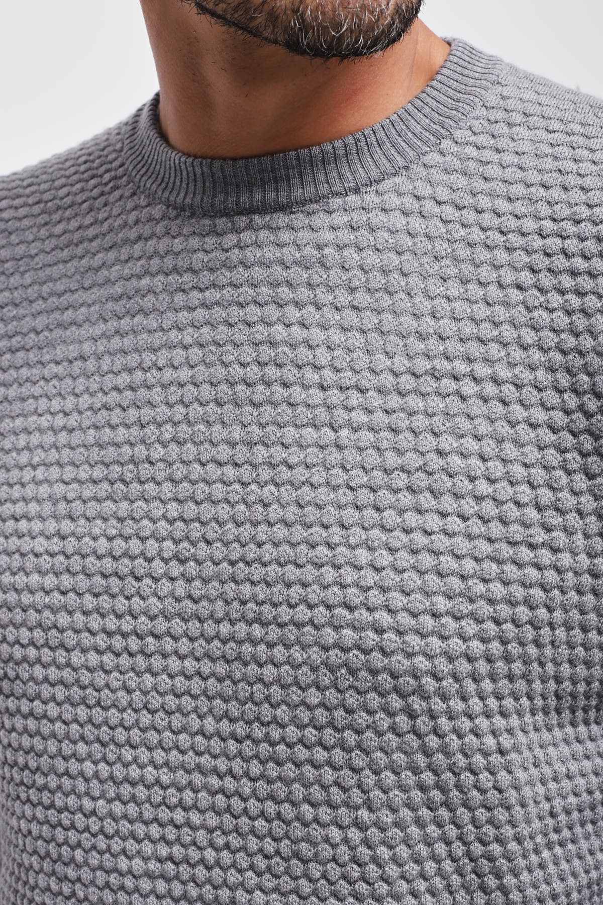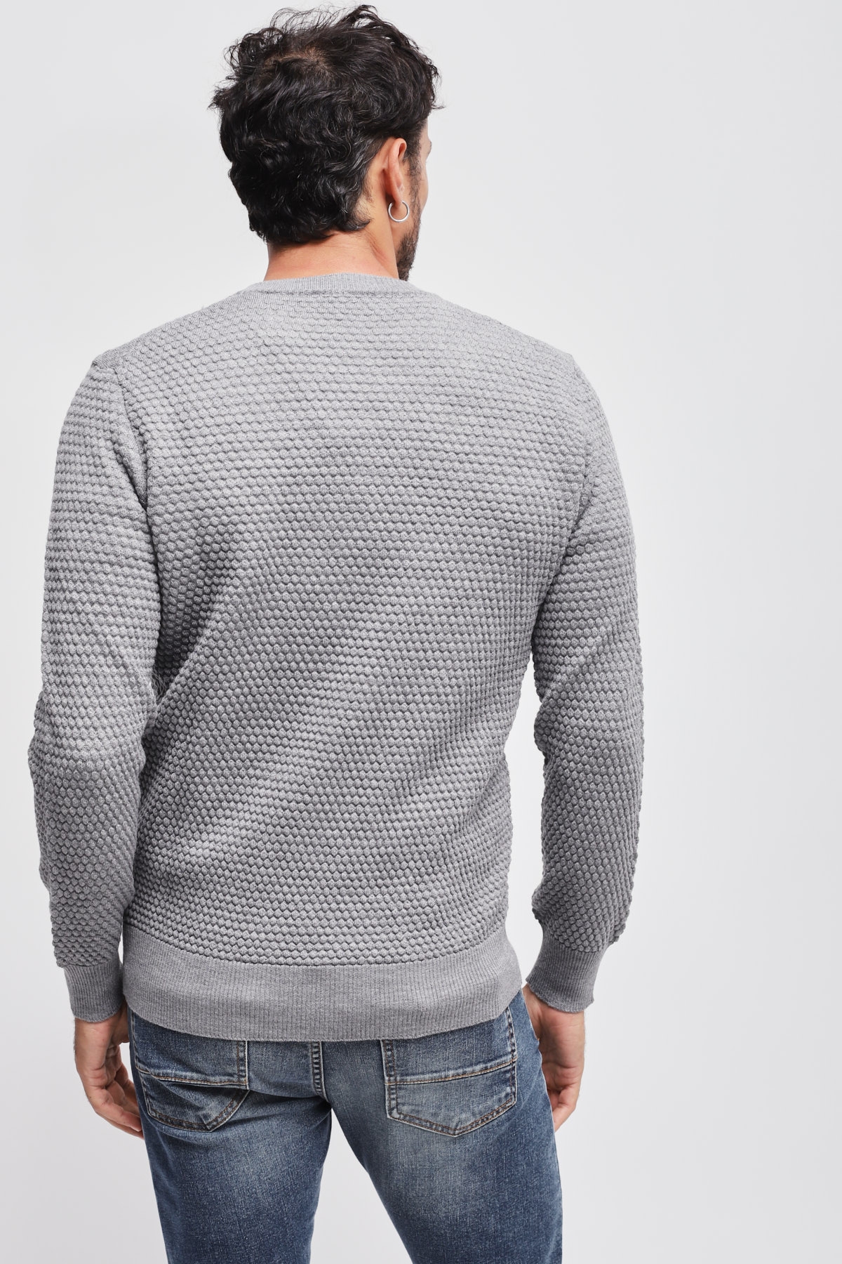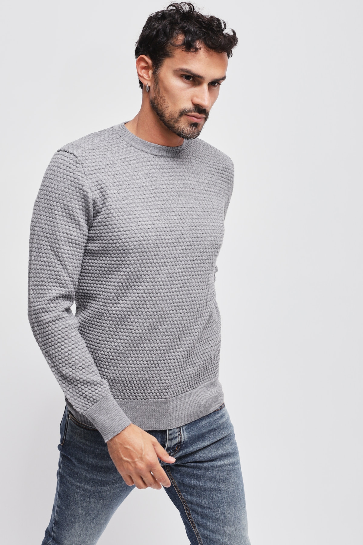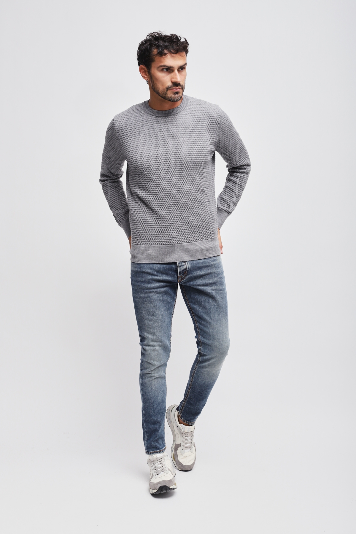 Maglione in lana a girocollo della nuova collezione Kangra uomo autunno inverno 2025. Il modello ha una lavorazione del tessuto a nido d'ape, effetto 3D e maniche lunghe. Polsini, girocollo e fondo a coste elastiche.