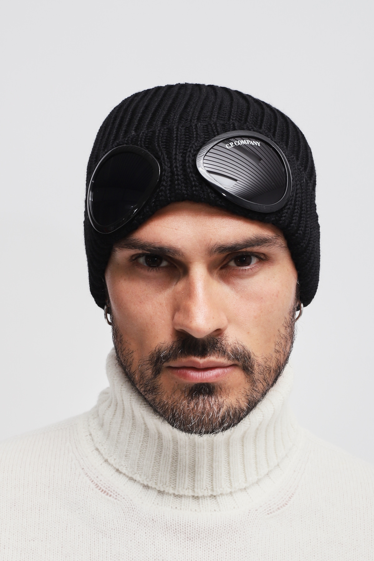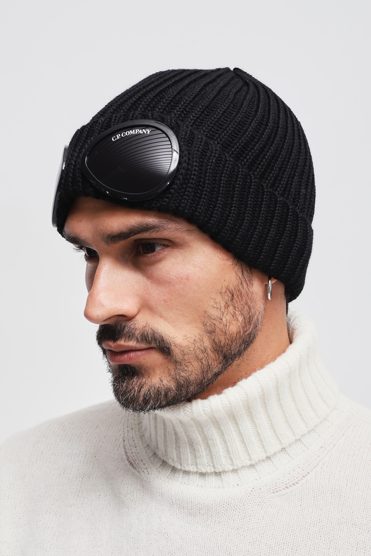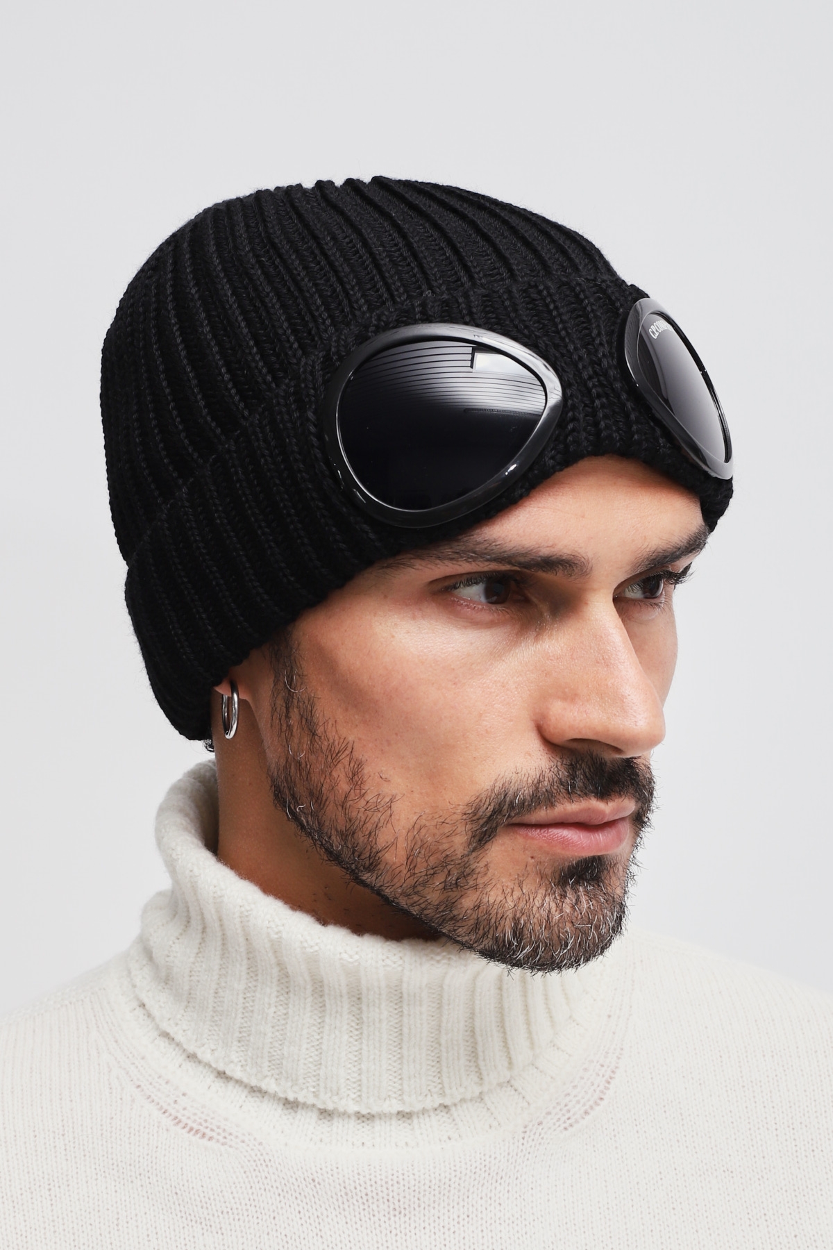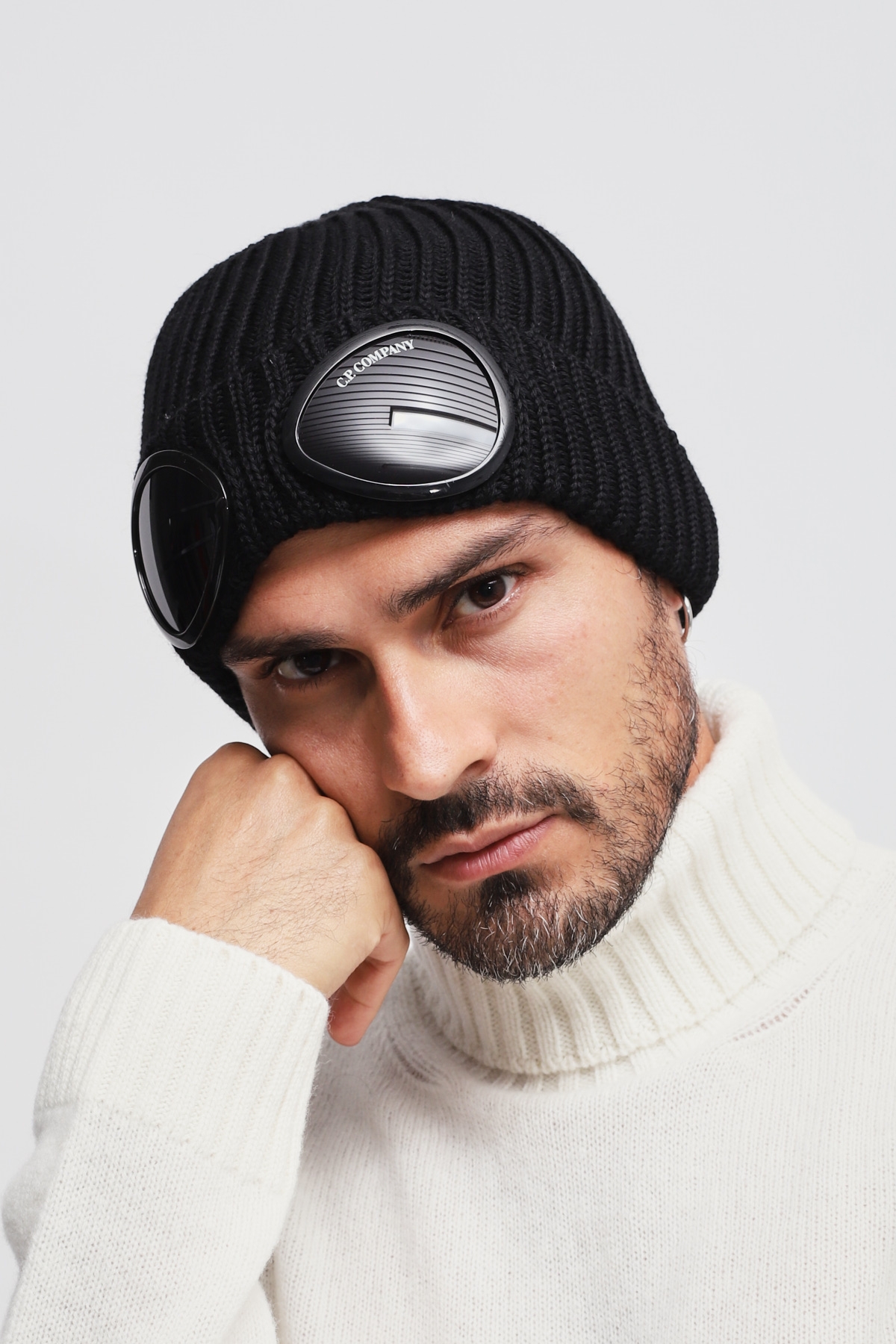 La Extra Fine Merino Wool Goggle Beanie è una cuffia di C.P. Company con lavorazione in maglia a costine spesse e Goggle sul risvolto.