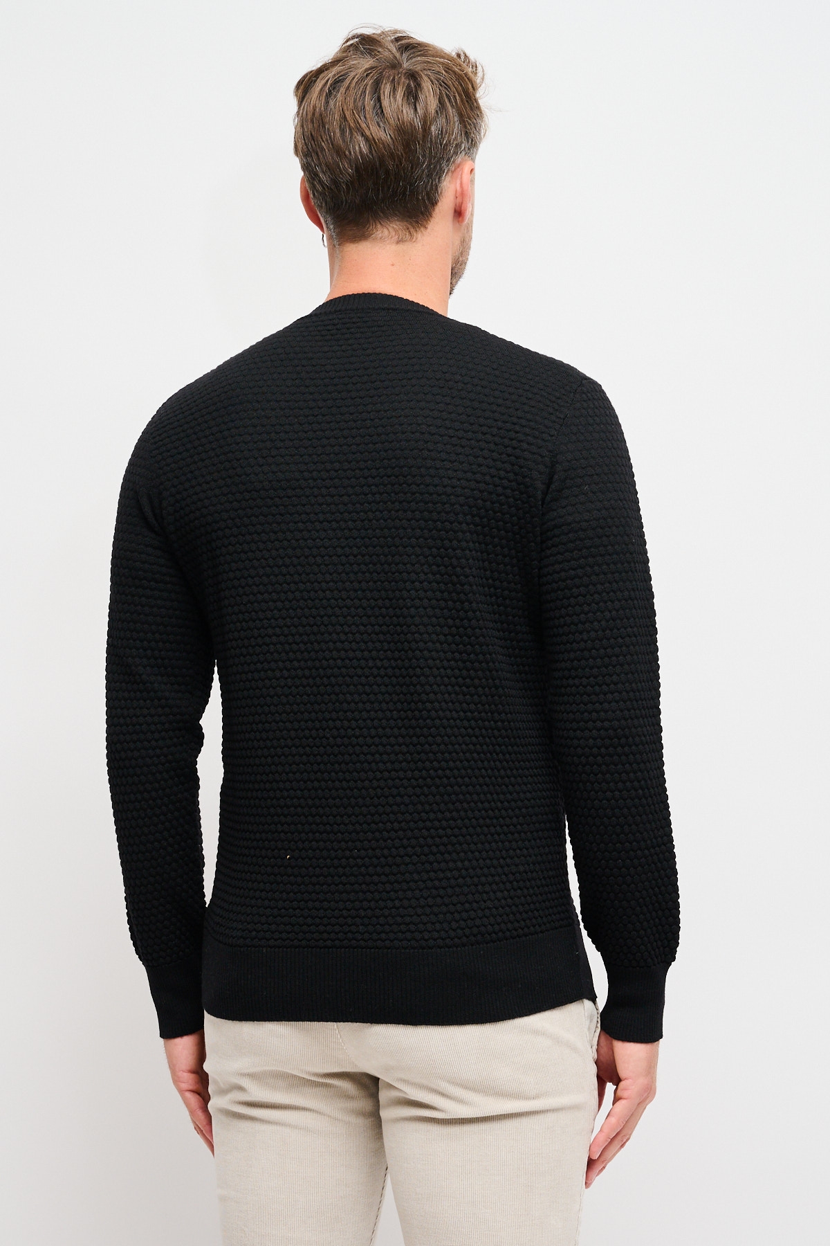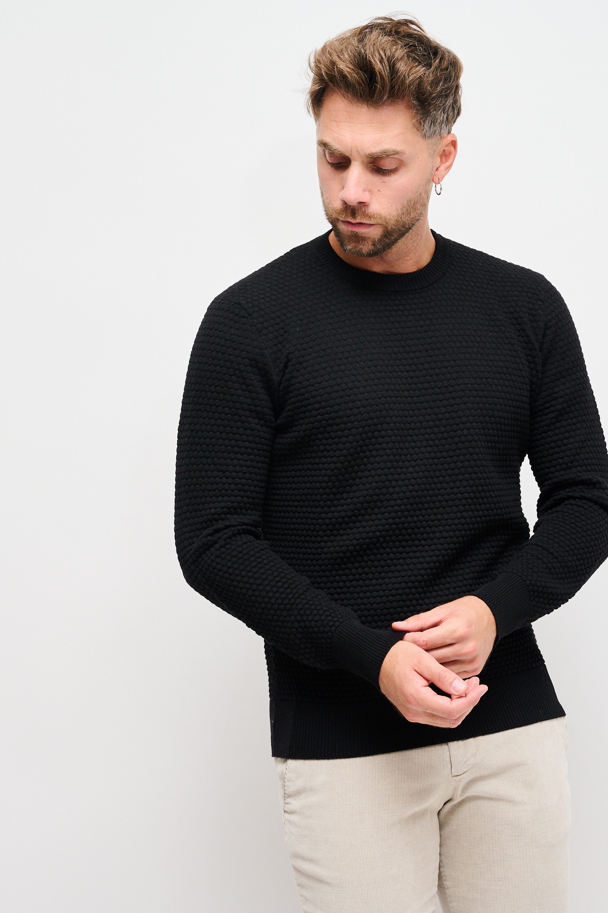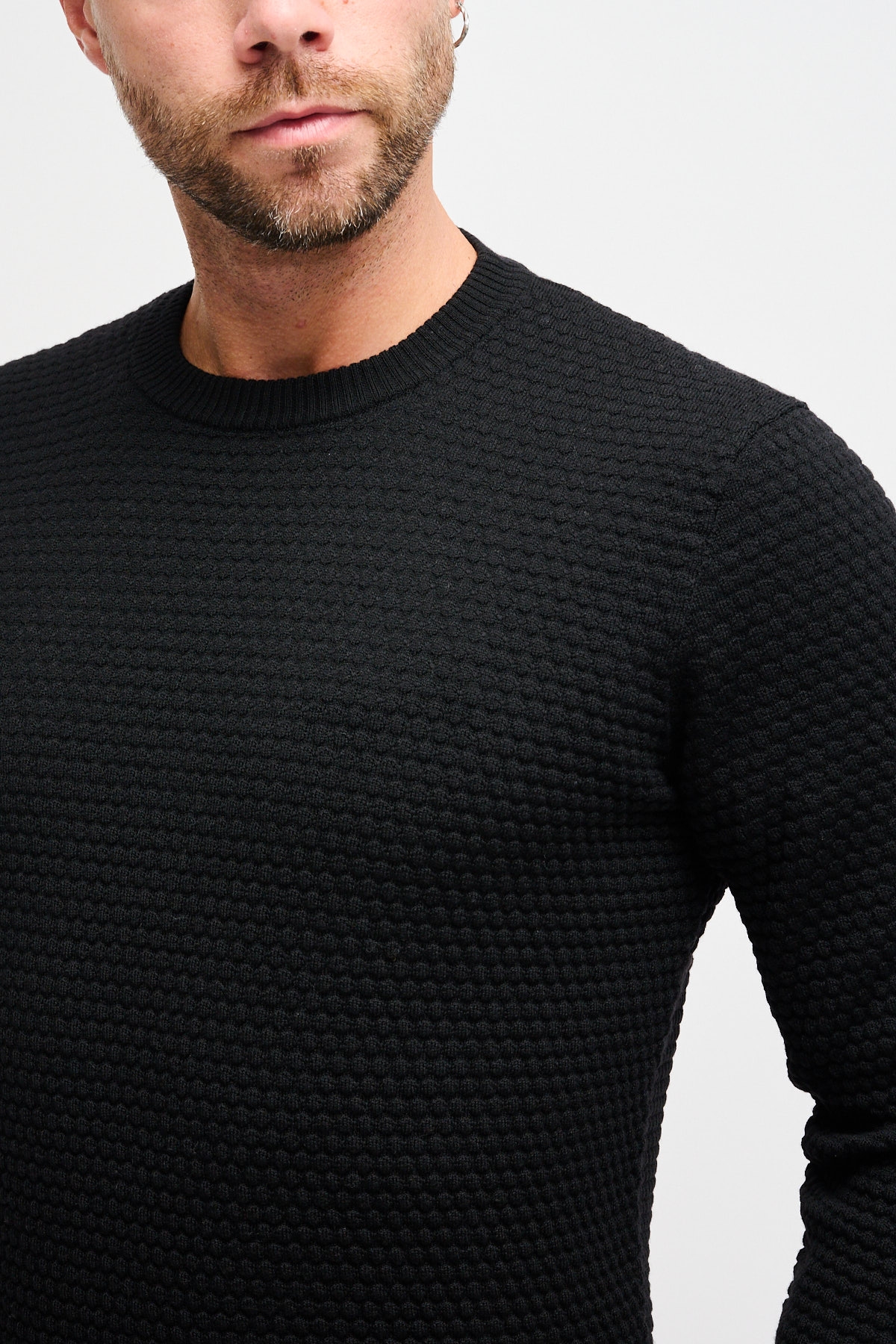 Maglione in lana a girocollo della nuova collezione Kangra uomo autunno inverno 2025. Il modello ha una lavorazione del tessuto a nido d'ape, effetto 3D e maniche lunghe. Polsini, girocollo e fondo a coste elastiche.