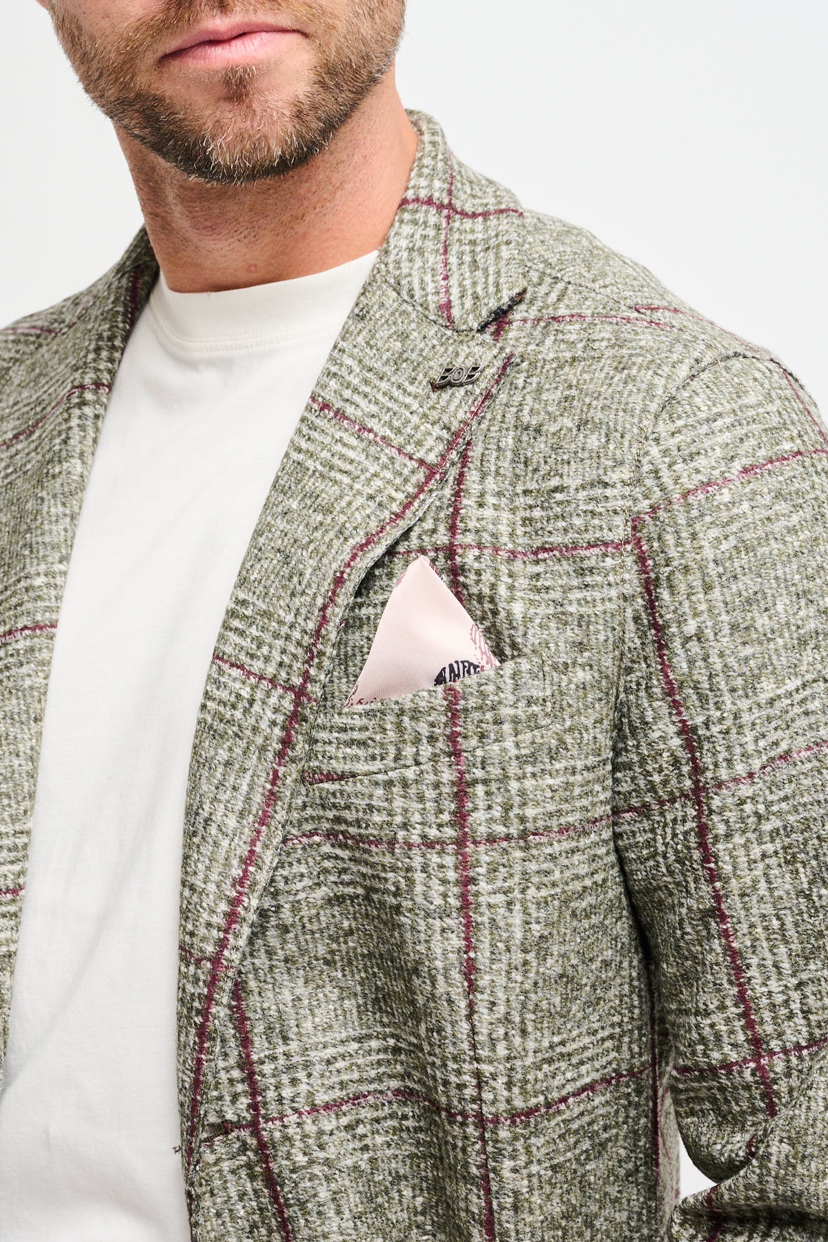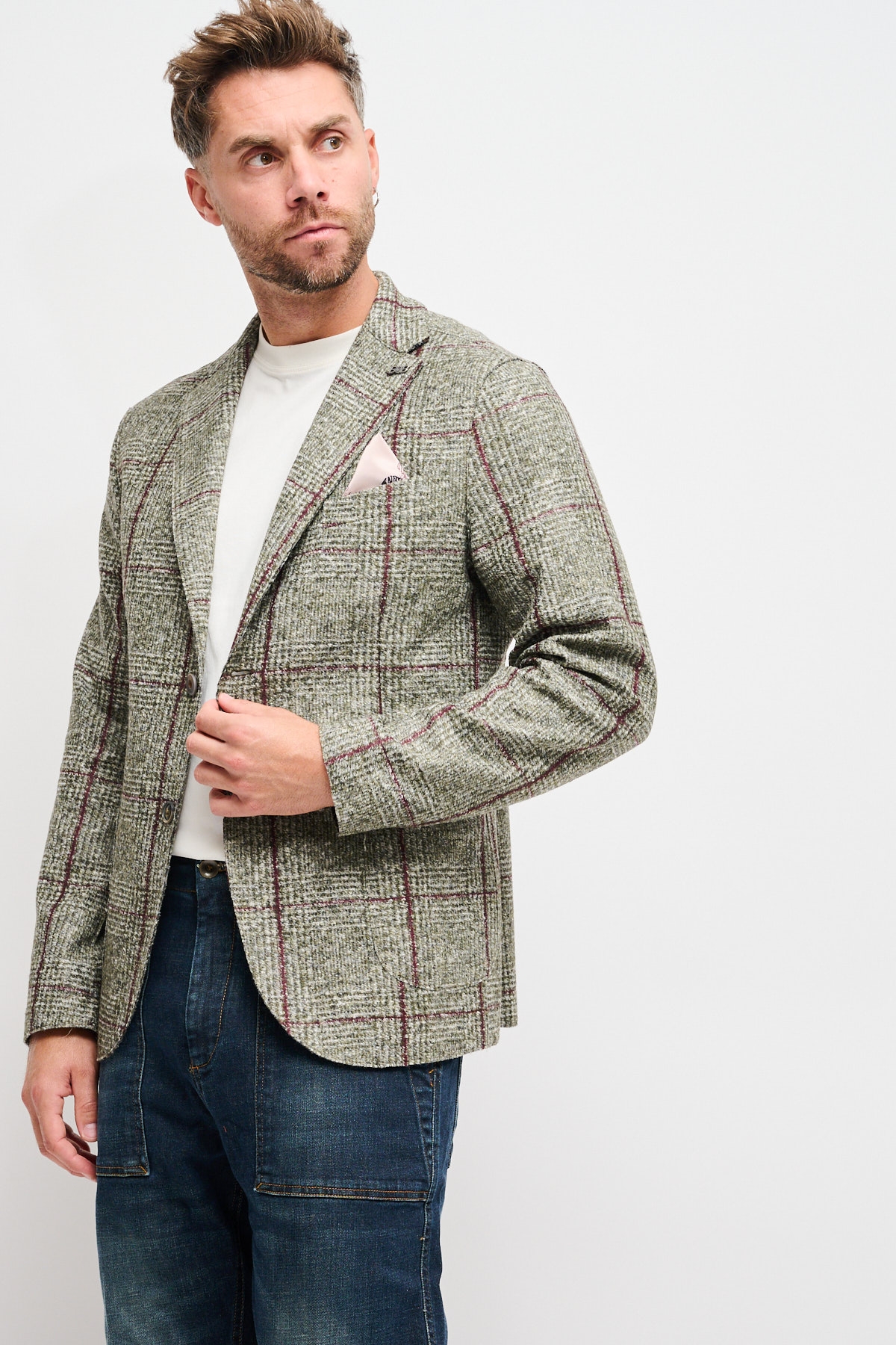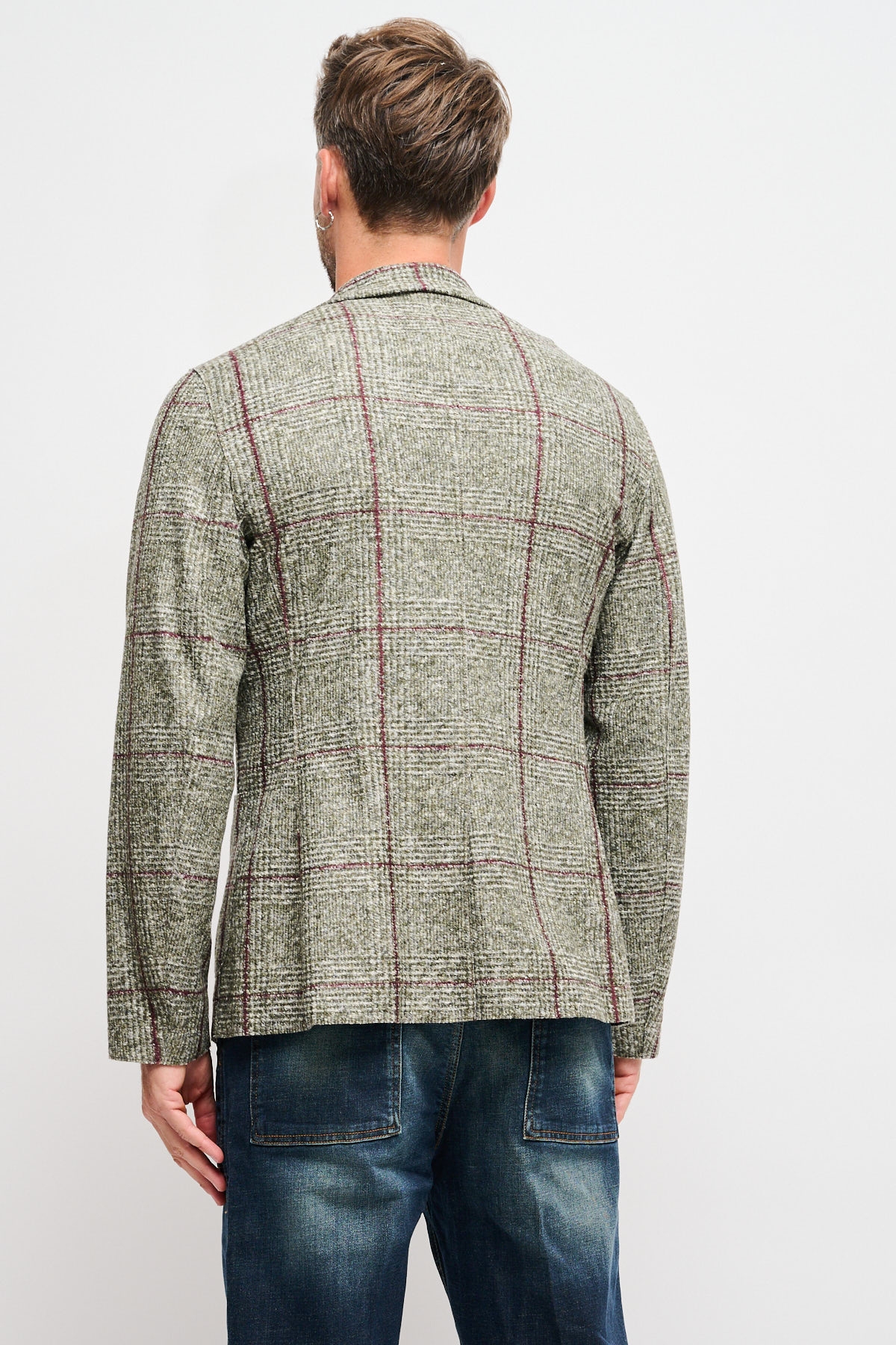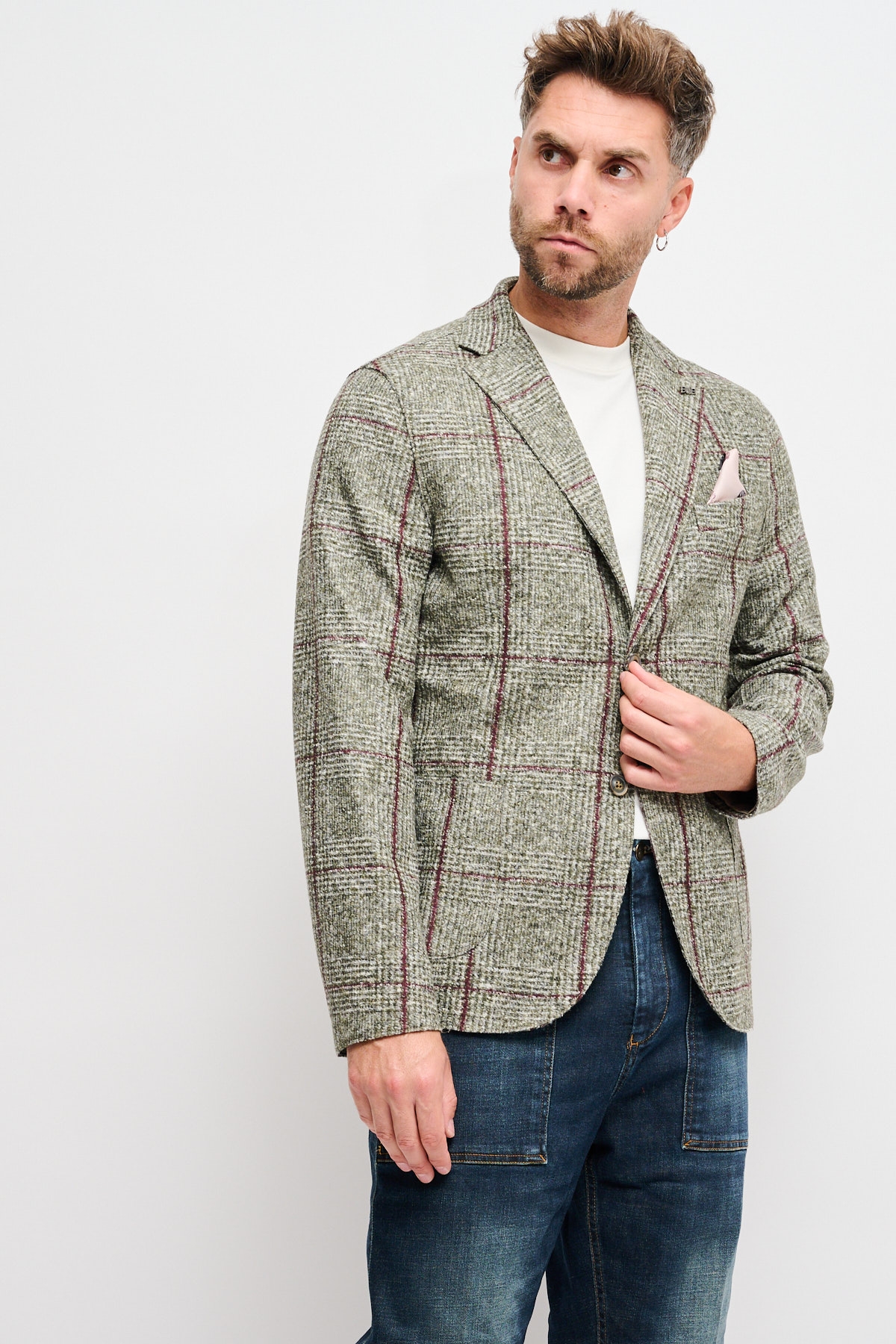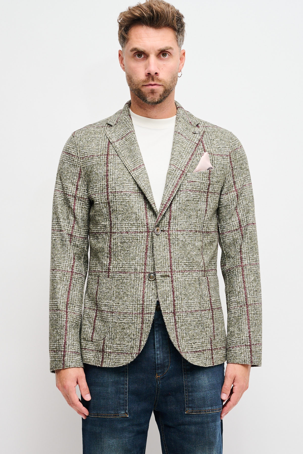 Due bottoni tasca a toppa in tessuto jersey di lana stretch stampa a quadri grigio e cuoio. Vestibilità slim . Giacca molto versatile e sportiva adatta ad ogni tipo di abbinamento.
