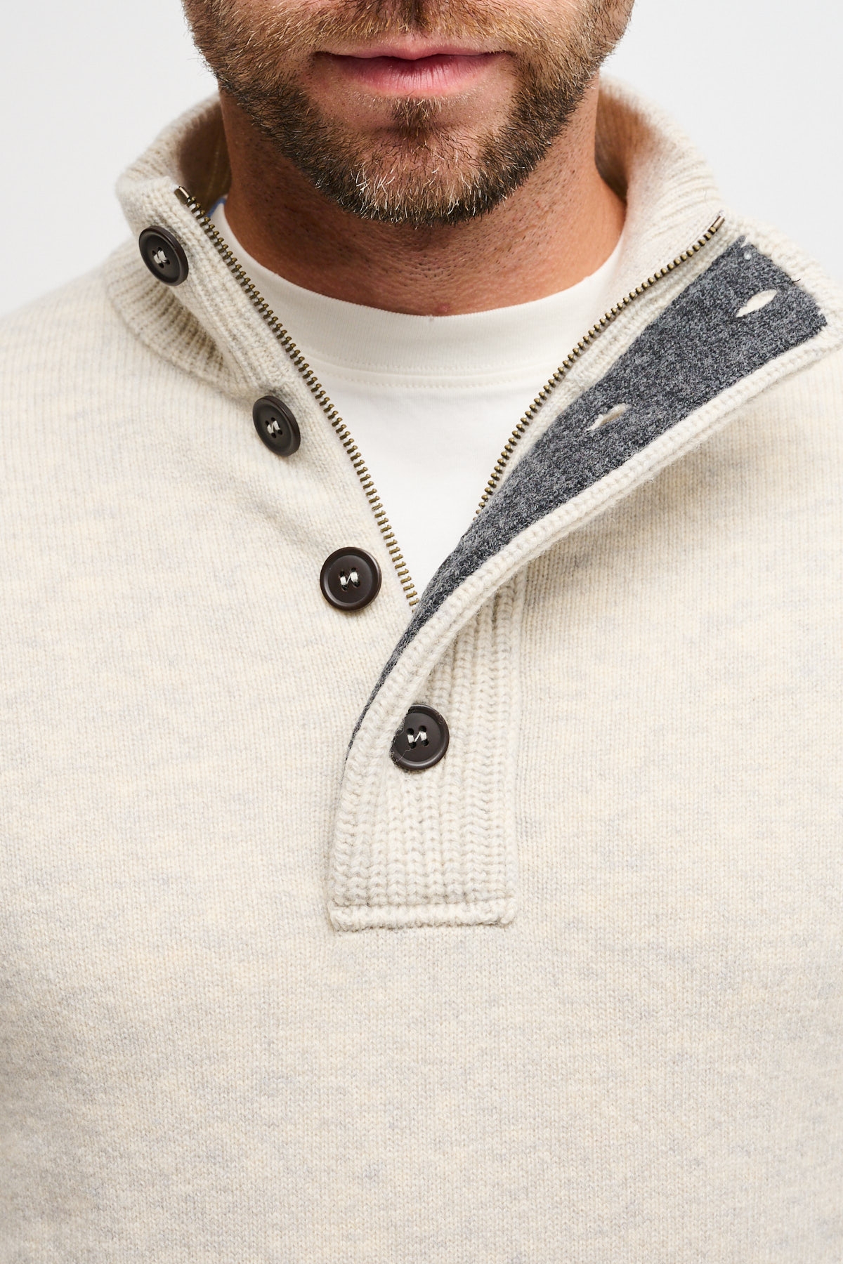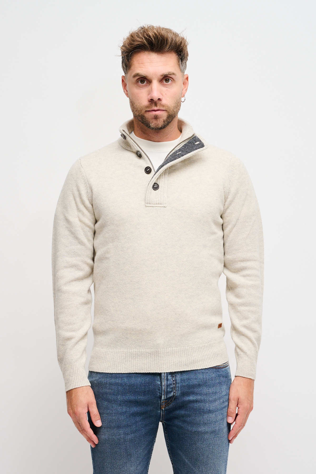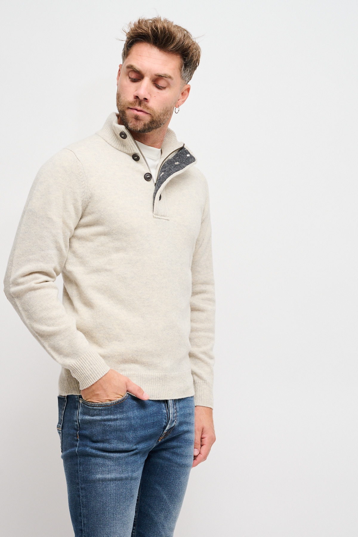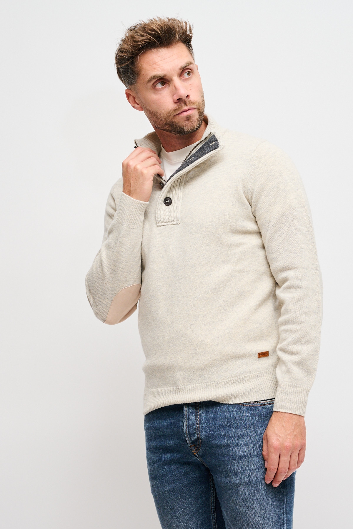 Maglia Barbour modello essential da uomo con dettaglio toppe in pelle sui gomiti e tre bottoni sul collo. Comodo e confortevole grazie al suo tessuto 100% lana.