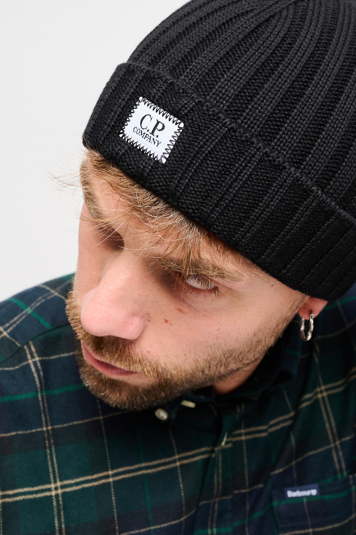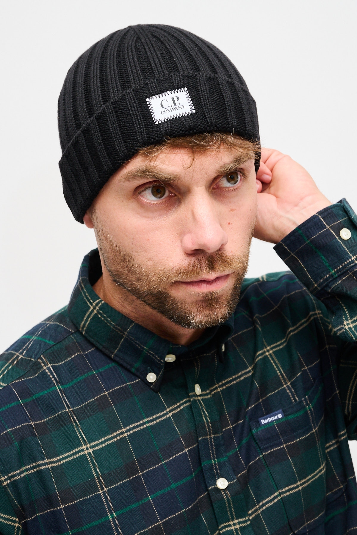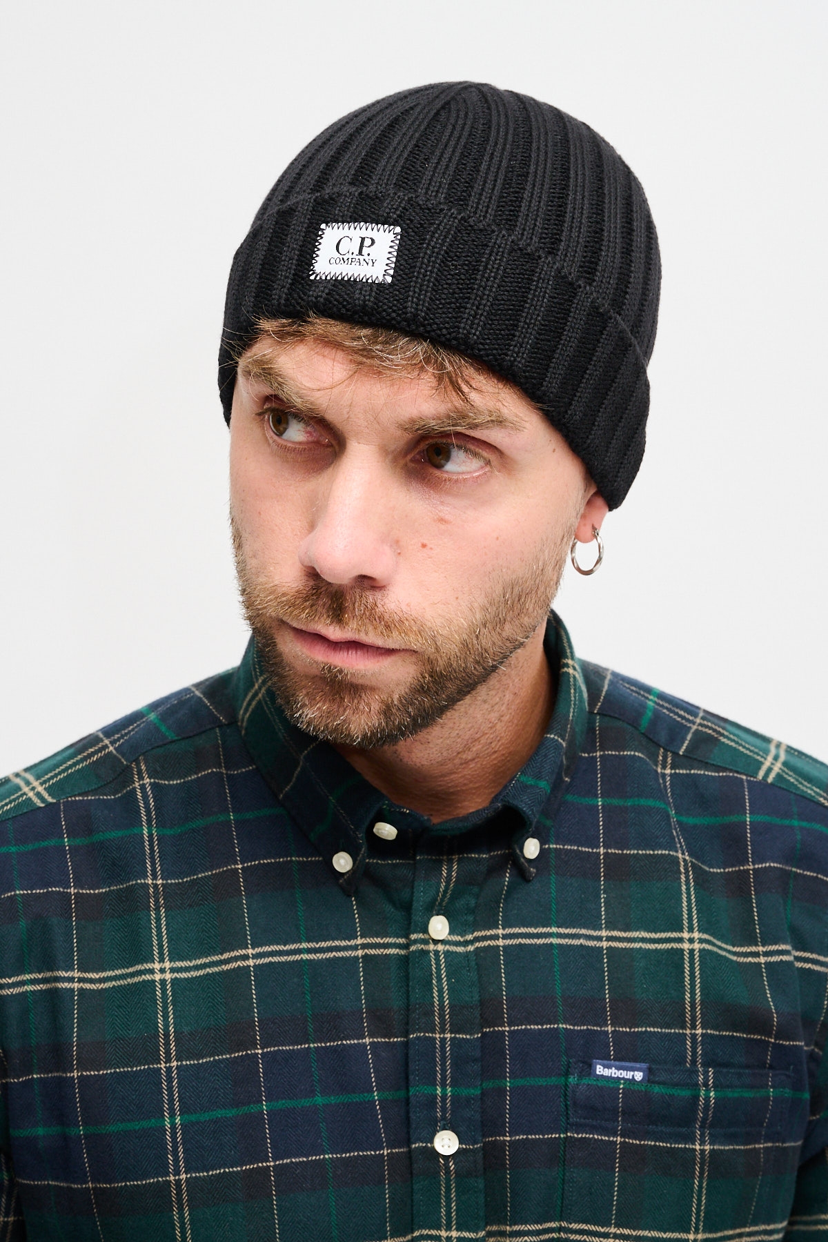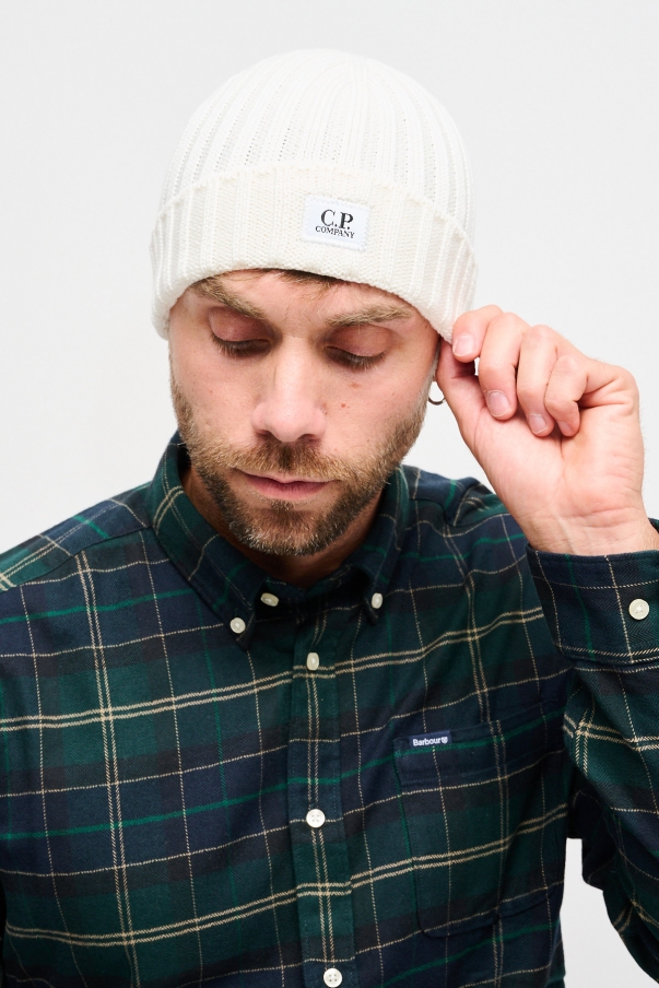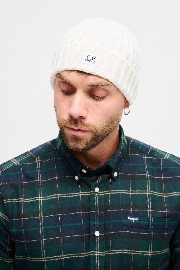 Cuffia con lavorazione in maglia a costine spesse e logo C.P. Company sul risvolto.