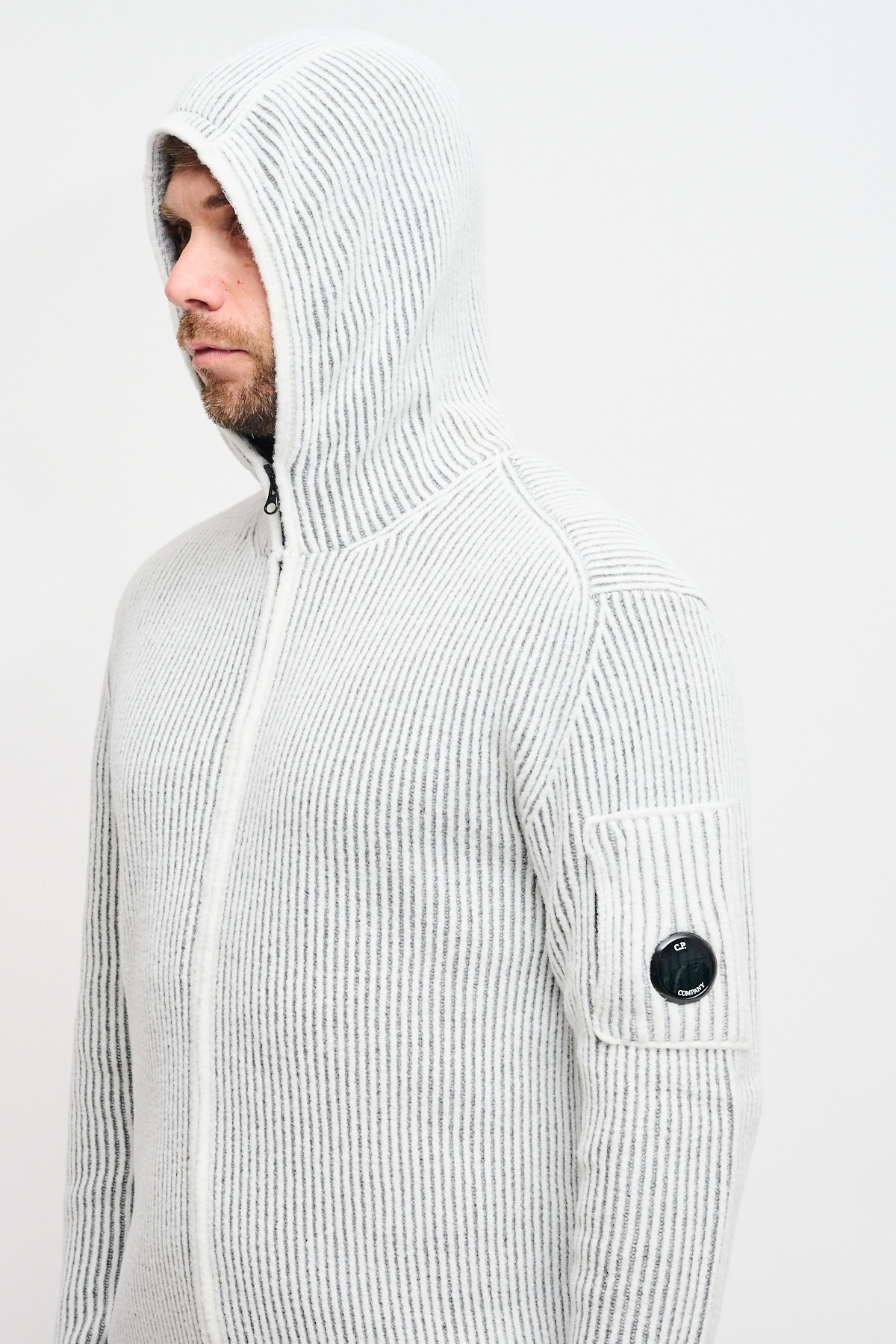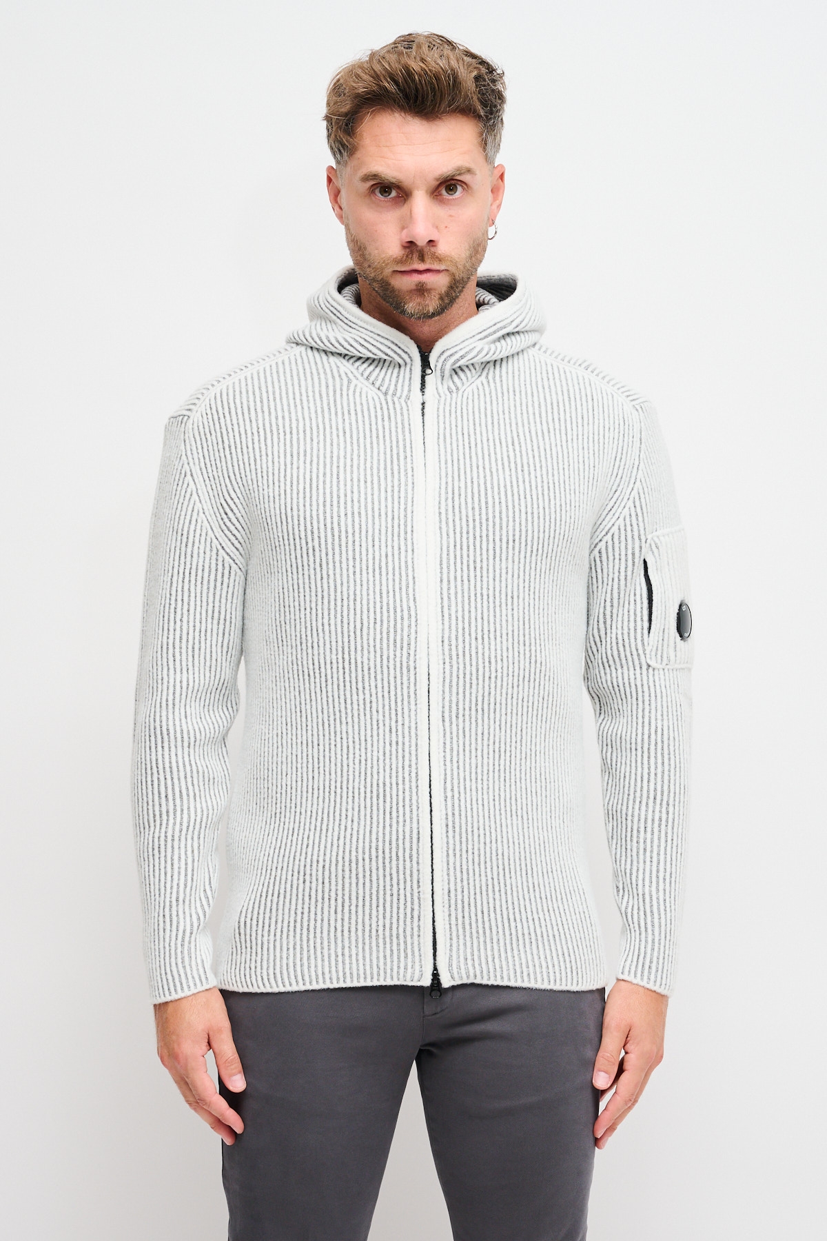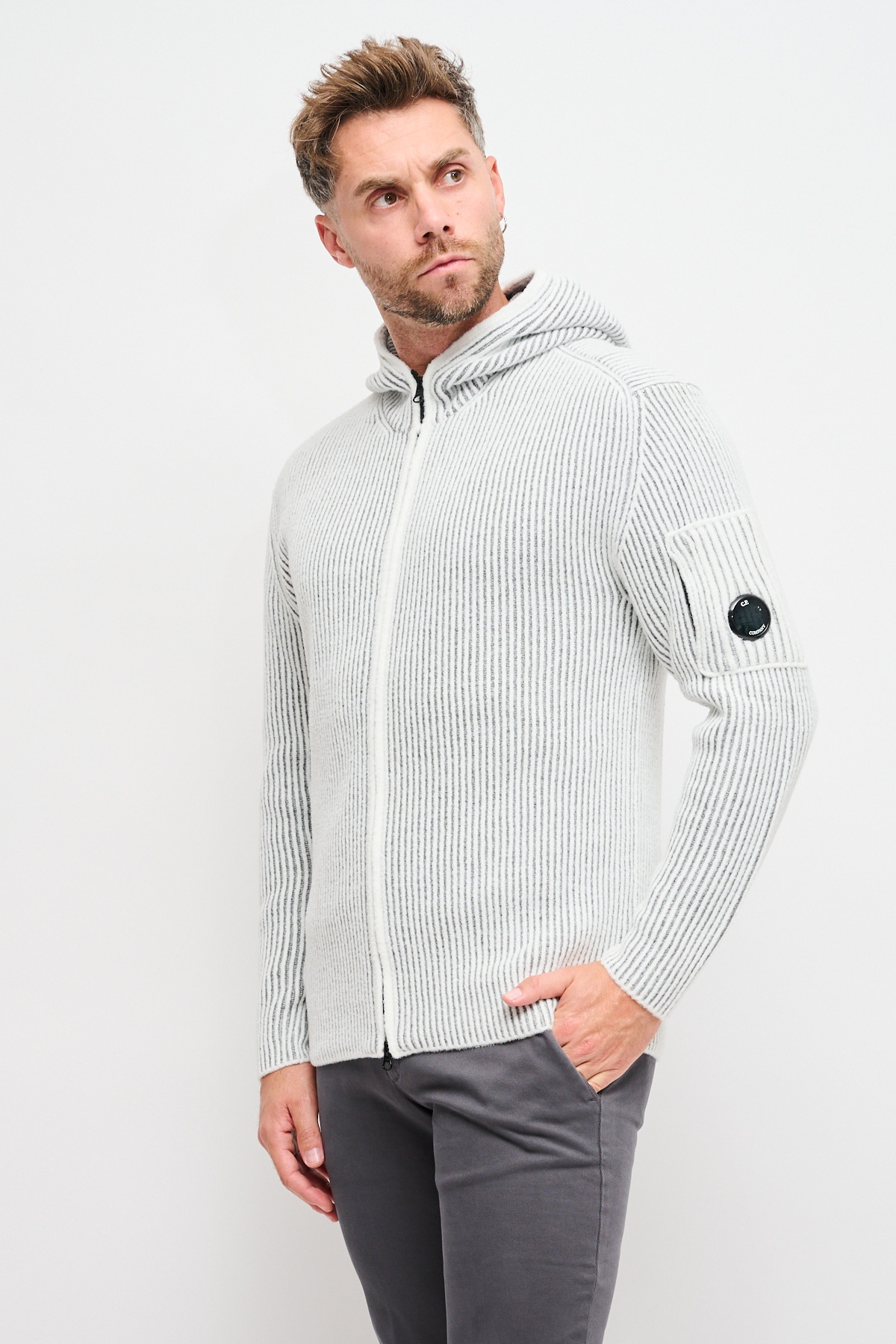 Maglione full zip realizzato in lana vanisé con ciniglia di poliestere a contrasto. Il modello presenta cappuccio regolabile e l’iconica Lente di C.P. Company. Finezza 7. Regular fit.