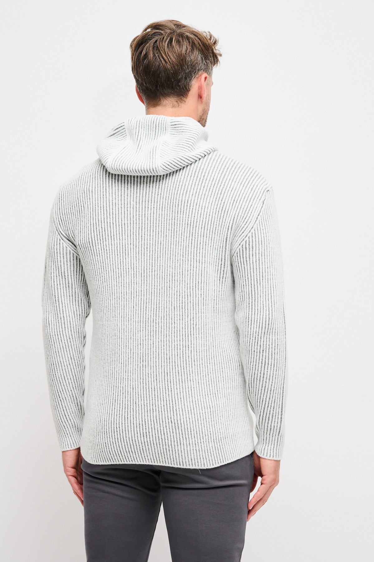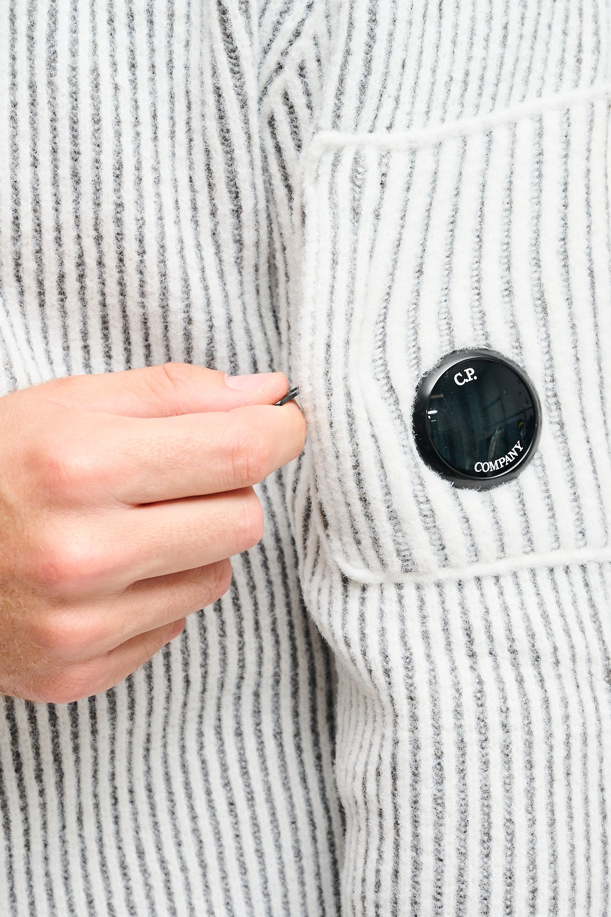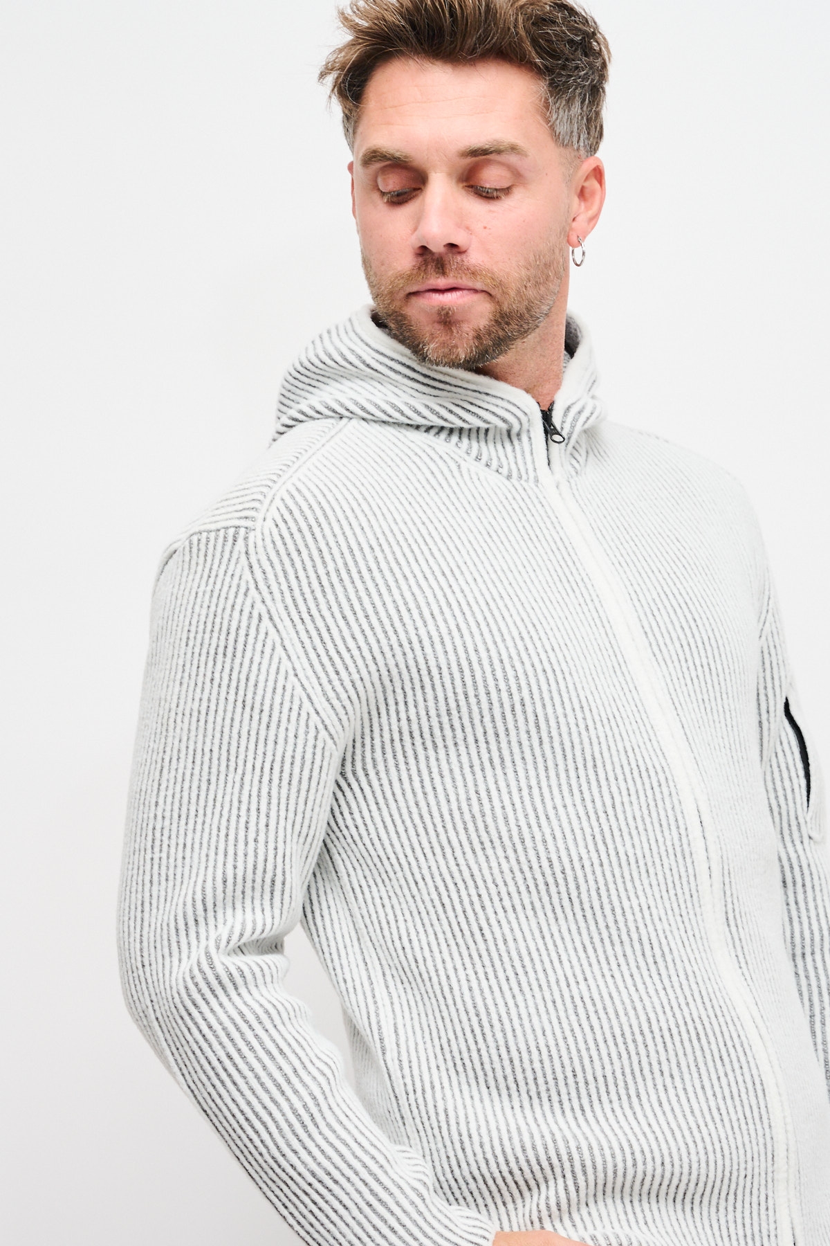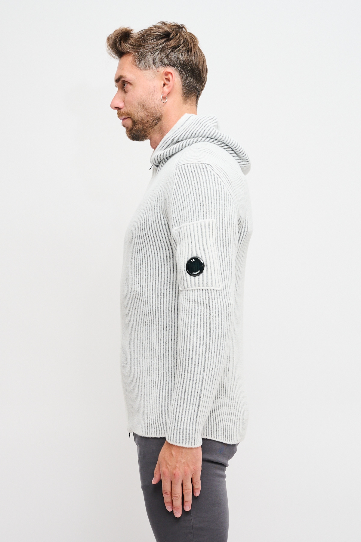 Maglione full zip realizzato in lana vanisé con ciniglia di poliestere a contrasto. Il modello presenta cappuccio regolabile e l’iconica Lente di C.P. Company. Finezza 7. Regular fit.