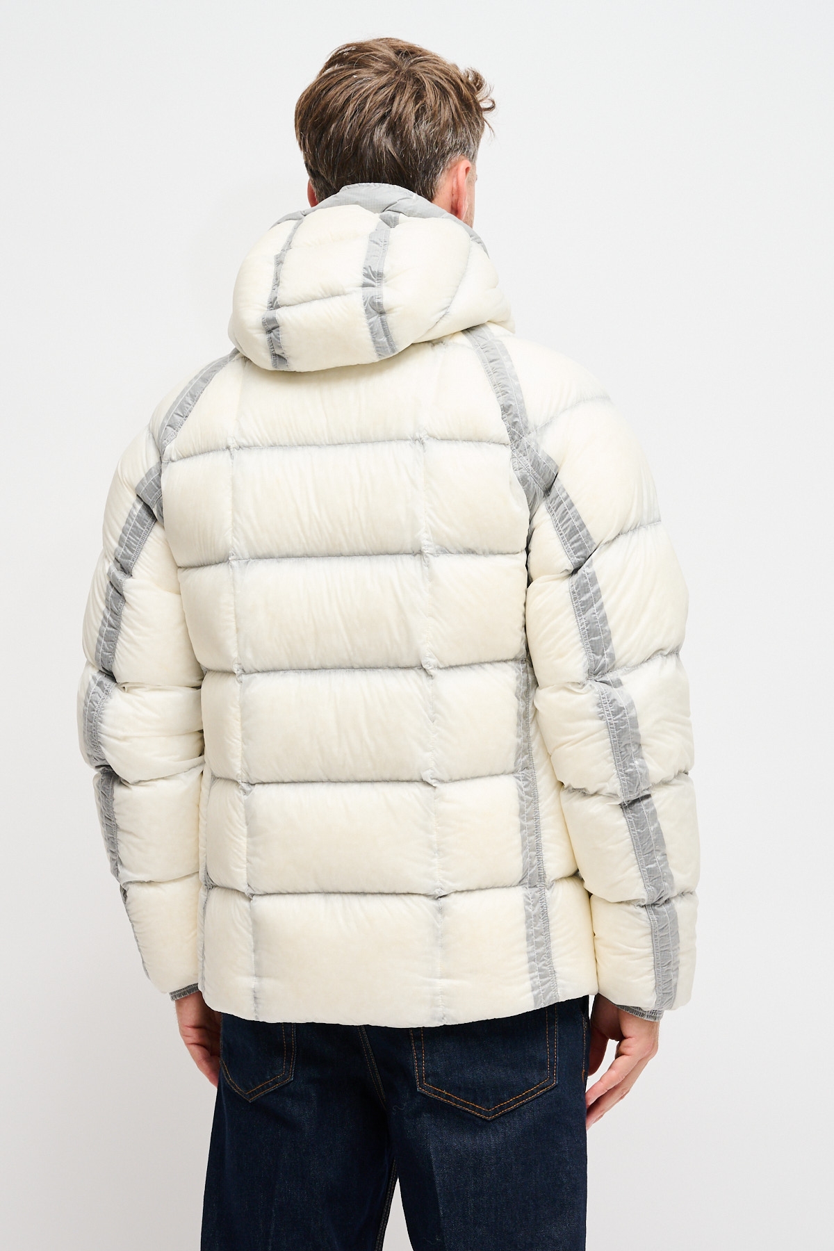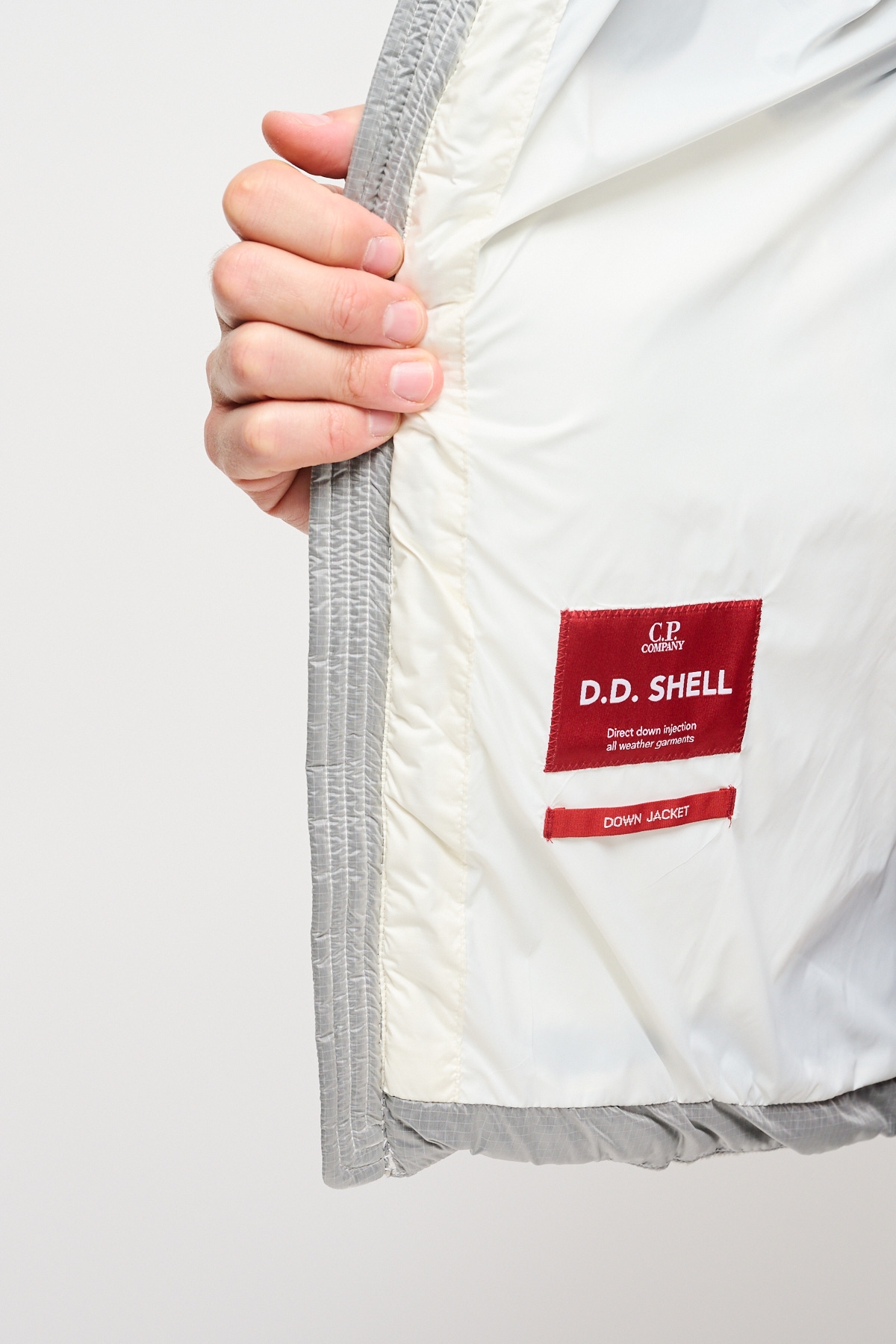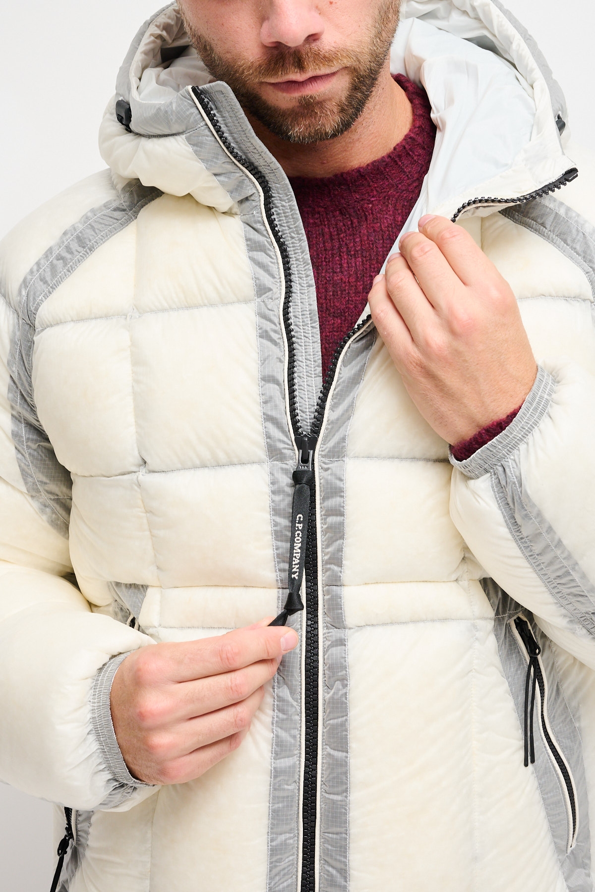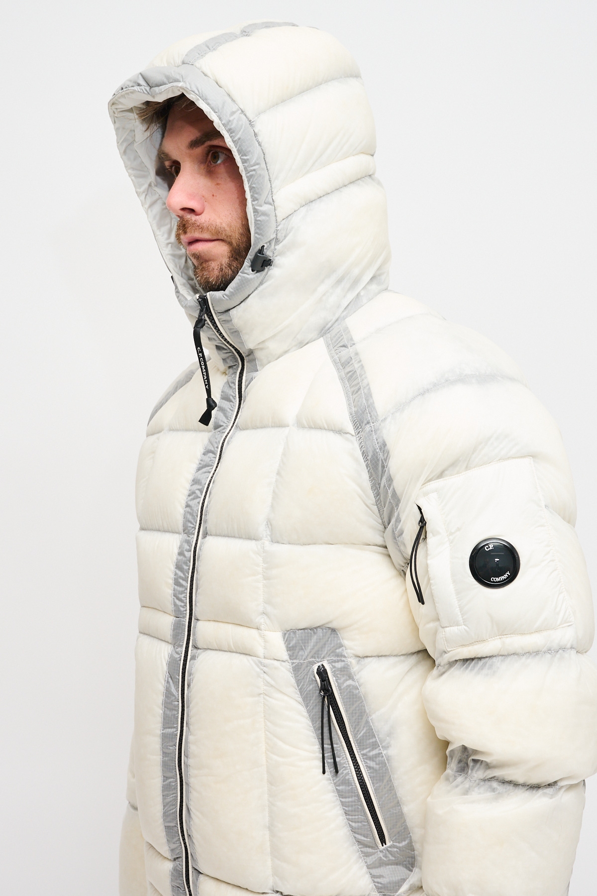 Piumino con cappuccio realizzato in D.D. Shell, un nylon micro-ripstop opaco 7 denari. La leggerezza e la trasparenza del materiale mette in risalto la costruzione, mentre il processo di iniezione a piuma diretta assicura un isolamento ideale. Il modello presenta cappuccio regolabile, chiusura full zip a doppio cursore, tasche laterali con zip, cuciture a contrasto, polsini elasticizzati, fondo regolabile con coulisse e l’iconica Lente di C.P. Company. Regular fit.